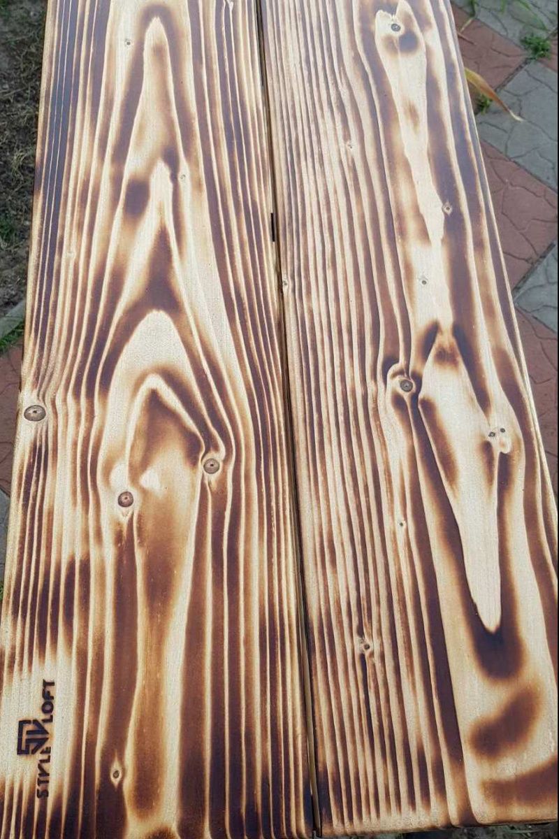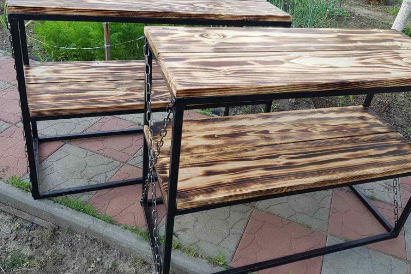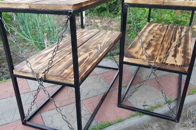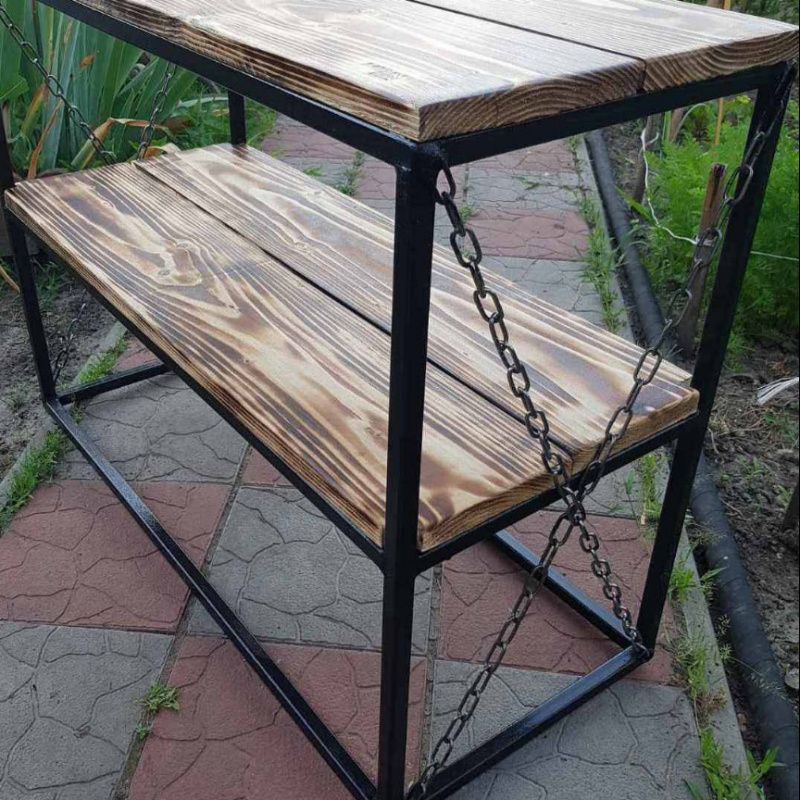 Оригінальний стилаж (тумба) в стилі "індустріальний лофт", Полиці з натурального дерева з елементом випалення та броштрування, Основа металу та ланцюга.