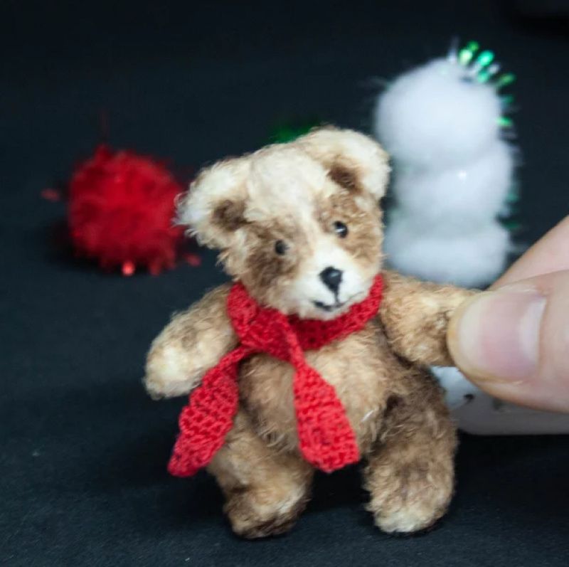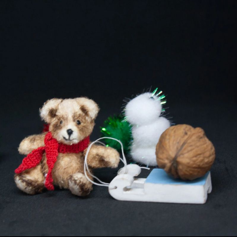 Ведмедик у техніці в'язаної тонованої мініатюри, зріст 5,5 см. Лапки рухаються, голова повертається, очі - бісеринки. Шарфик з'ємний. Дерев'яні санчата - в комплекті.