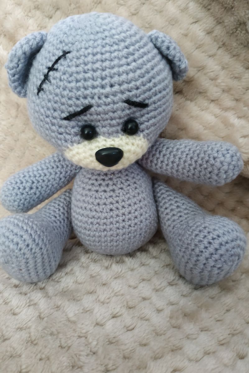 Мишко виконаний з акрилової пряжі, носик і очі на безпечному кріпленні, ручки і ніжки рухливі.