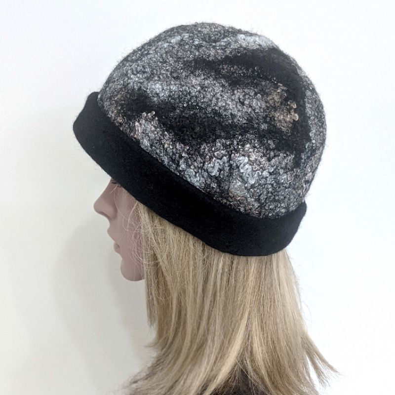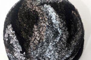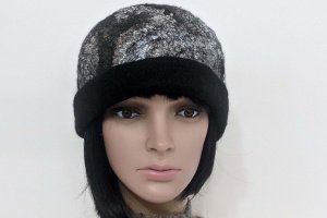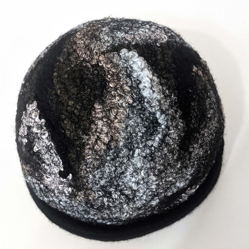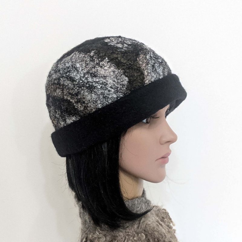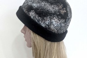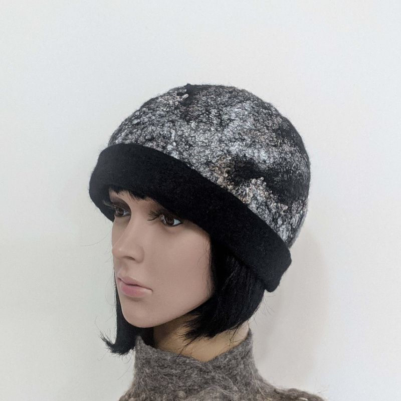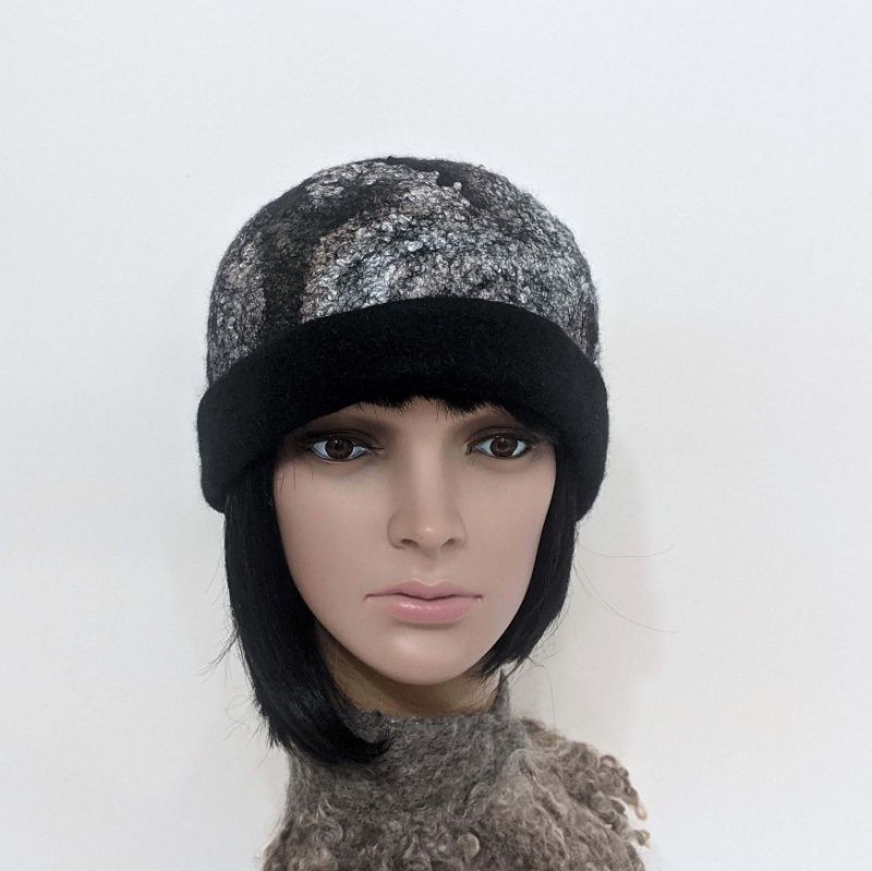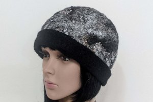 Шапочка ′ Перлина Чорна з сріблом ′ виконана з мериносової вовни італійського виробництва, щедро декорована шовковими волокнами і волокнами рослинного походження.