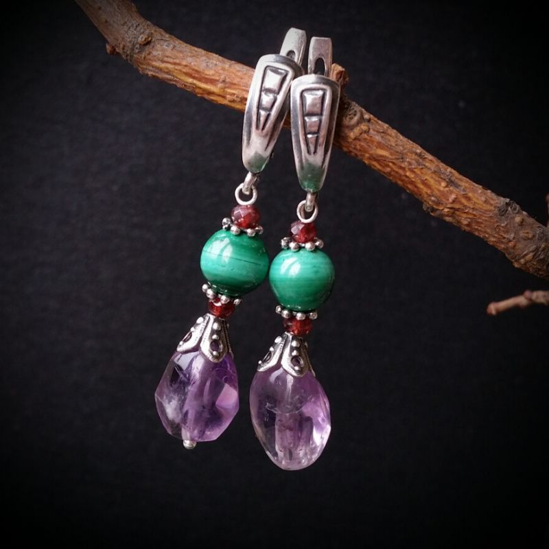 аметист, малахіт натуральний, гранат, срібло 925 проби