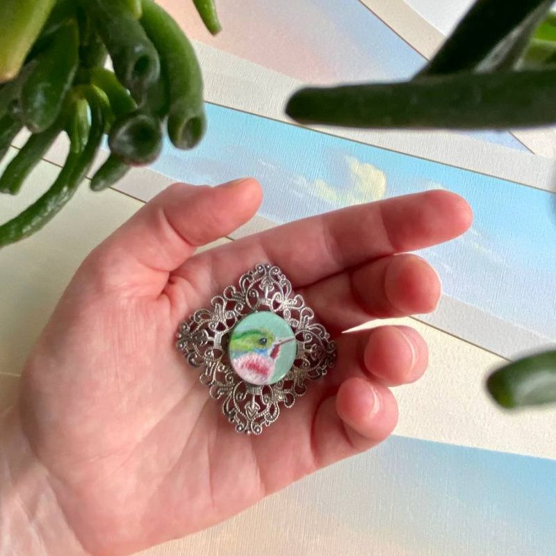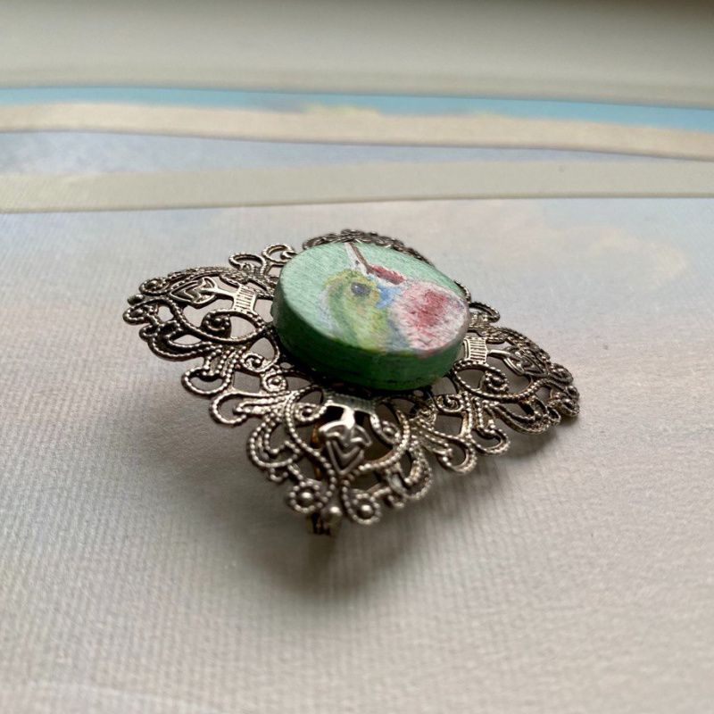 Авторська брошка у вінтажному стилі з фарбованим дерев'яним кабошоном. На малюнку зображена маленька пташка колібрі.