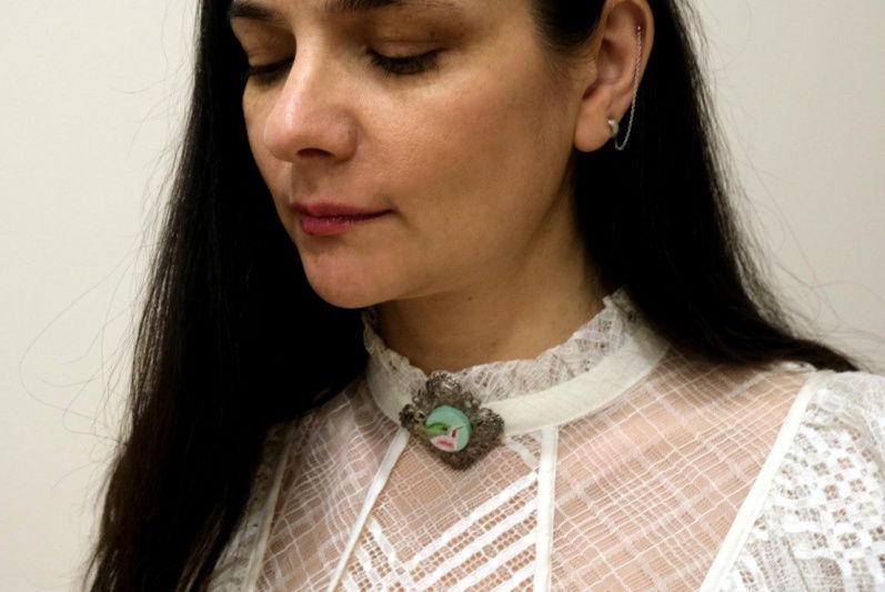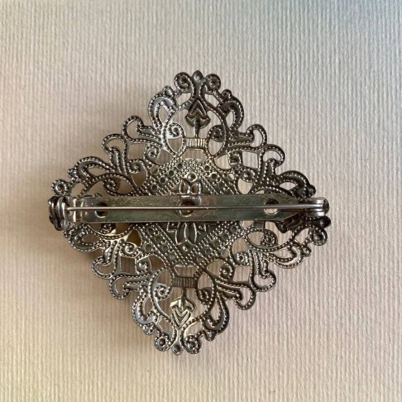 Мереживна металева фурнітура дуже добре передає легкий романтичний настрій брошки.