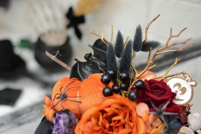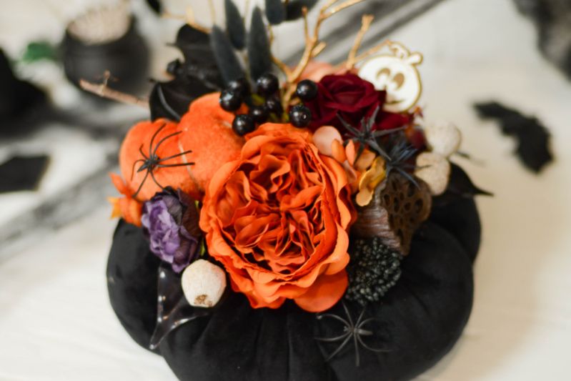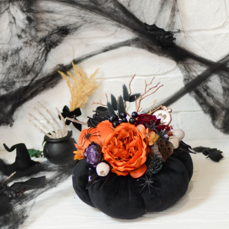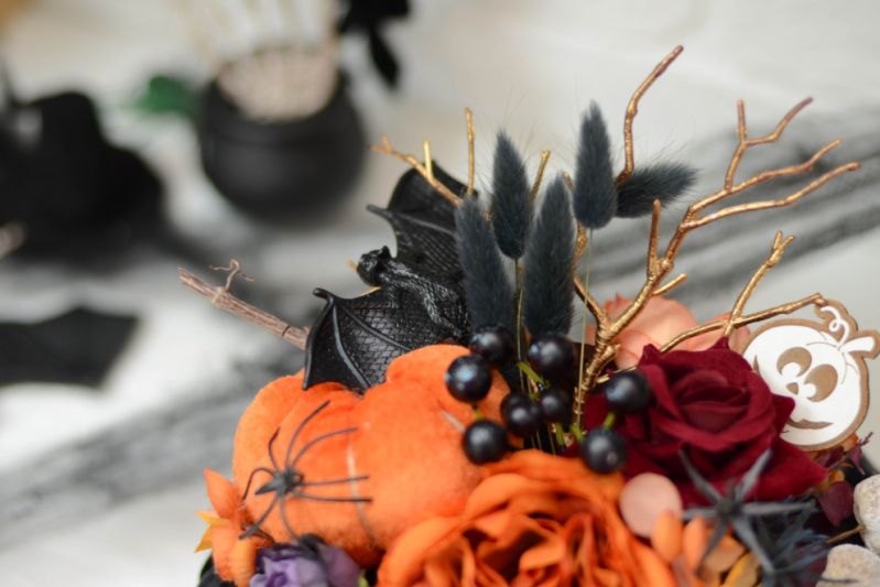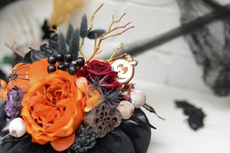 Композиція осіння в формі гарбуза. Рясно прикрашений безліччю сухоцвітів, дерев'яних тиковок, павучків, летючої миші, штучних квітів і т.д .. Композиція зроблена на основі оксамитової гарбуза ручної роботи, прикрашеного декором. Цікаве доповнення інтер'єру або фасаду будинку. Загальний розмір 21 * 19 см ширини і 23 см заввишки