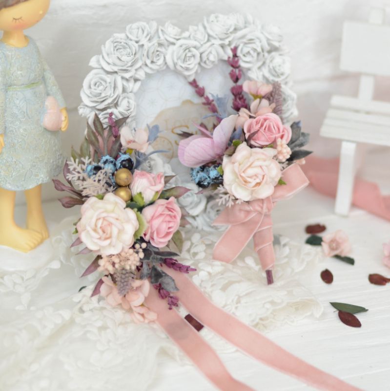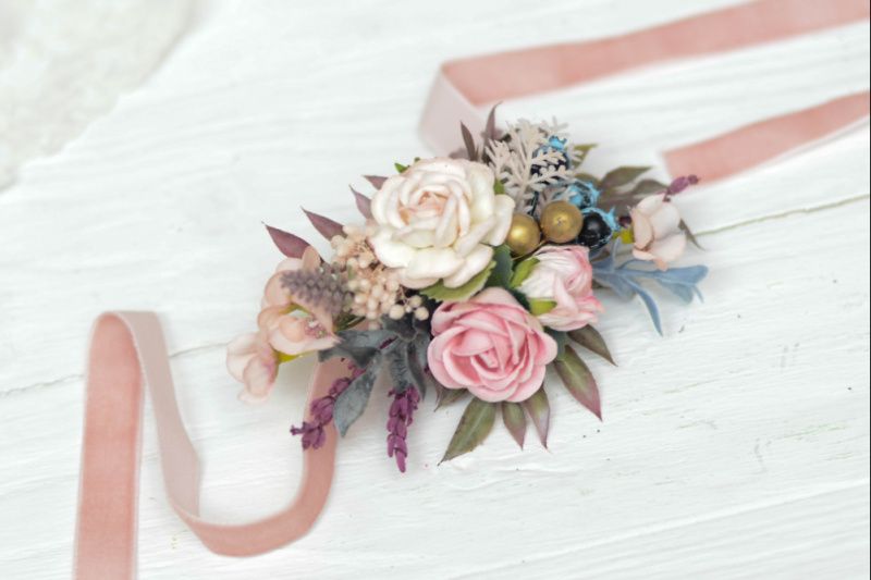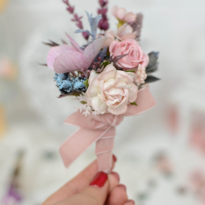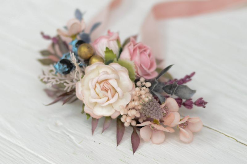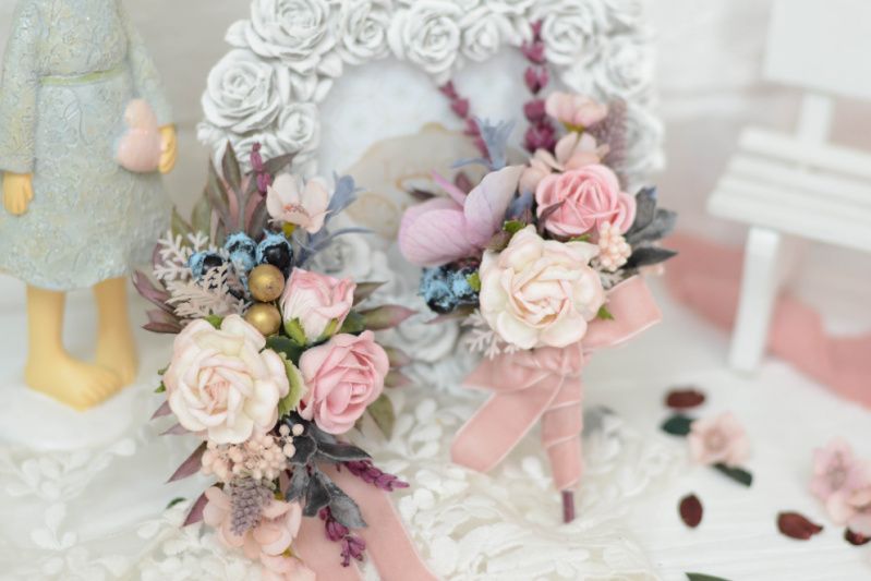 Дивовижна розкішна бутоньєрка з квітами, з зеленню і ягодами на оксамитової стрічці. Комплект 1 бутоньєрка і 1 браслет браслет: 1,5 см шириною * 0,7 м 13 * 7 см бутоньєрка 15 * 7см стрічка оксамит
