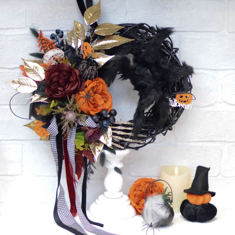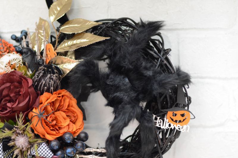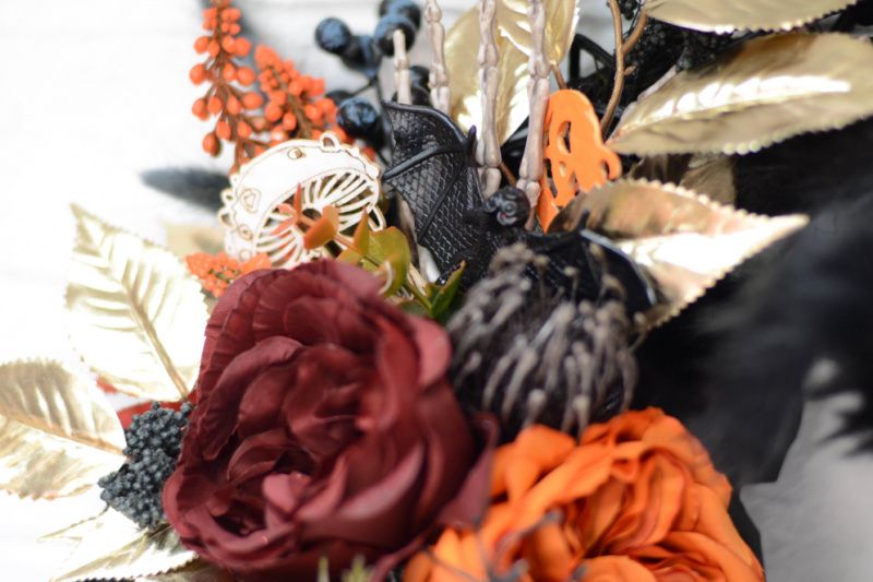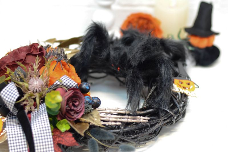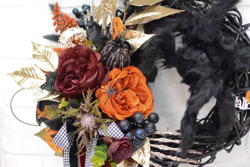 Композиція на стіну у формі вінка. Рясно прикрашений безліччю штучних квітів, листя, кажанів, тиковок, великого об'ємного пухнастого павука, ведьмовского казанка, штучних кистей рук і т.д .. Композиція зроблена на основі вінка з лози. Цікаве доповнення інтер'єру ресторану, будинки на свято Хеллоуїн. Загальний розмір 35-40 см, довжина 67см