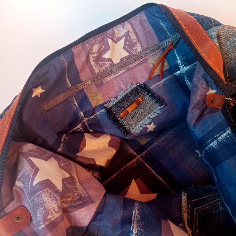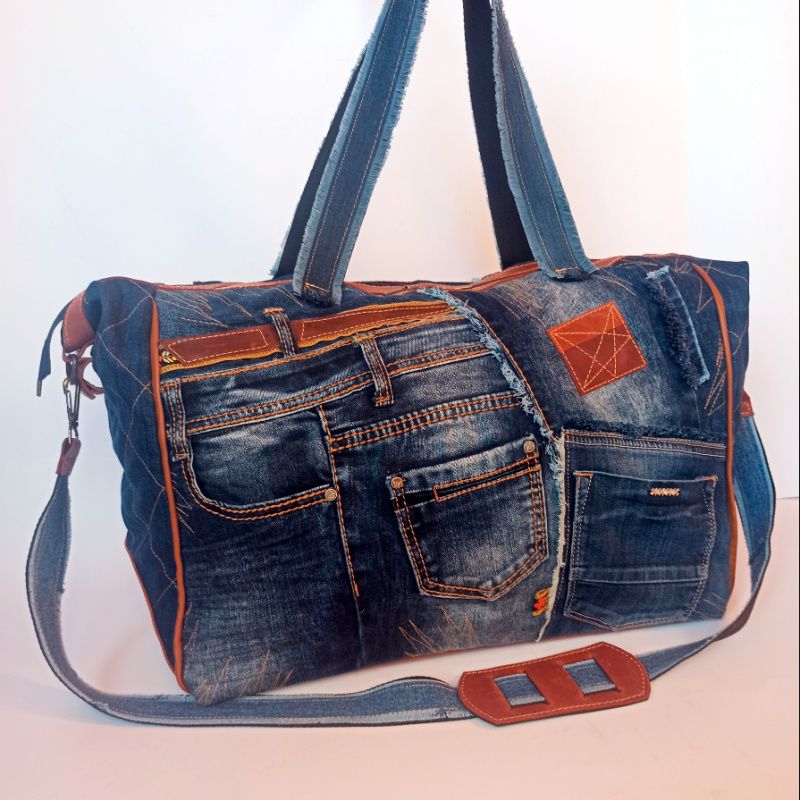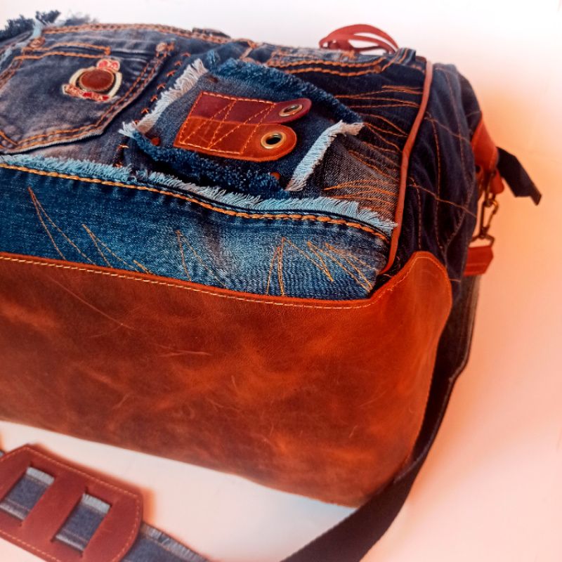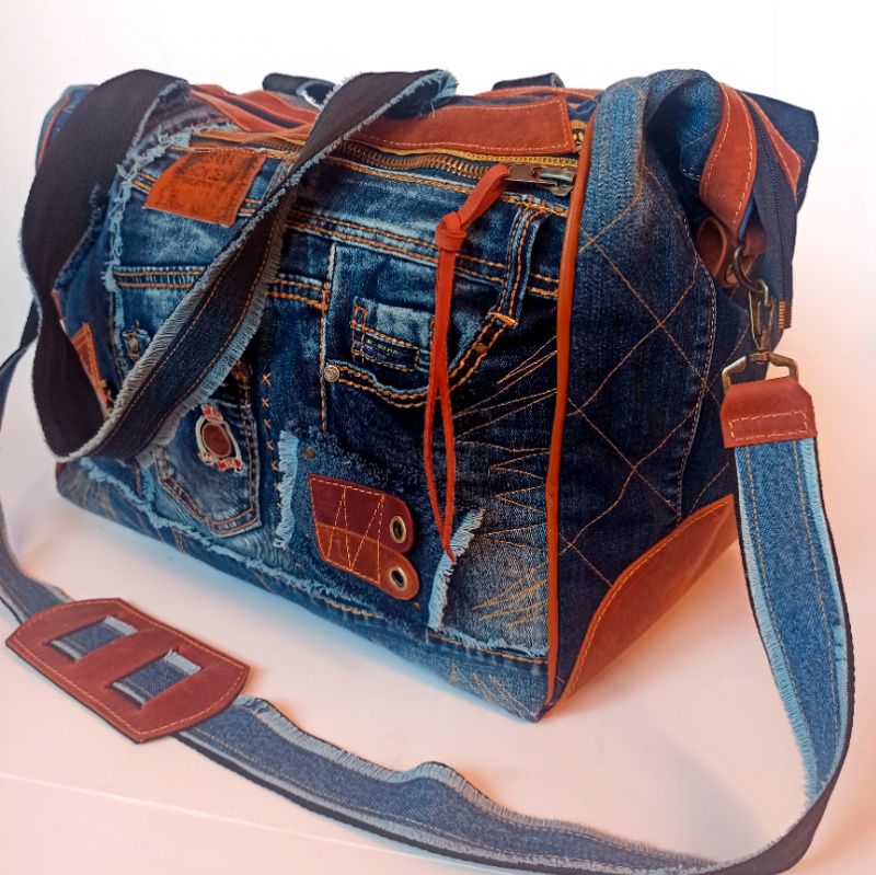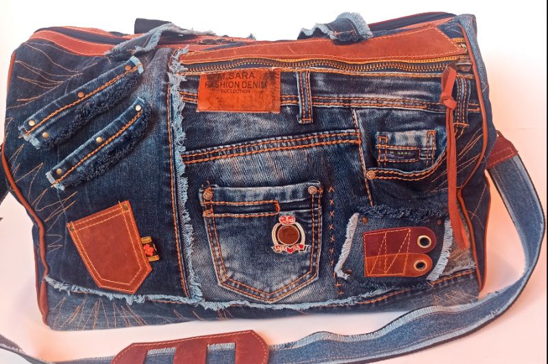 Сумка унісекс. Велика, міцна, неповторна (у буквальному значенні слова). Зшита з джинси та шкіри крейзі хорс – чудова парочка! Застібка блискавка з двома бігунками для зручності. Є знімне тверде дно. Зовні купа кишень великих та маленьких. Всередині кишеню на блискавці і відкритий. Є довгий знімний ремінь зі зручною шкіряною плечовою накладкою. Усередині бавовняна підкладка.