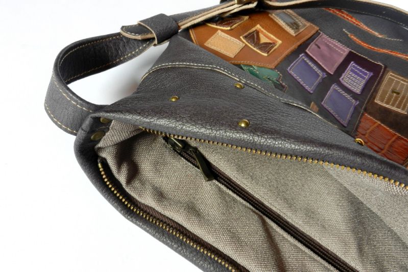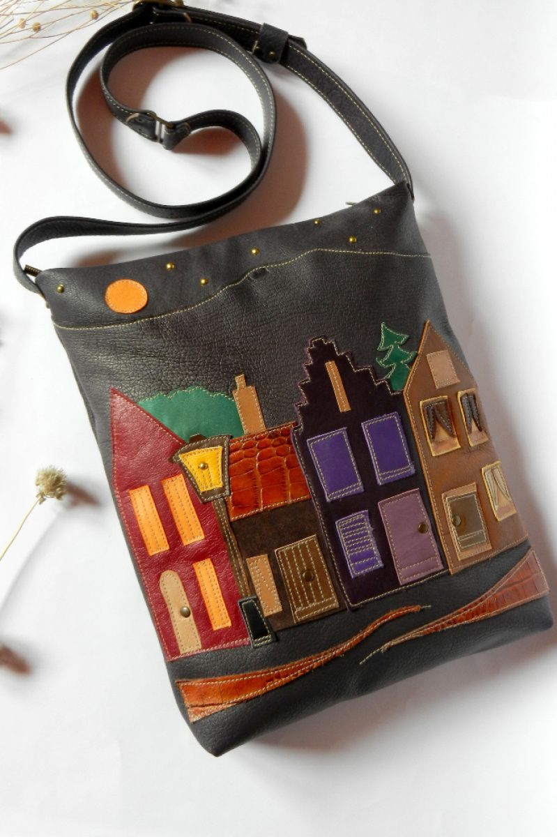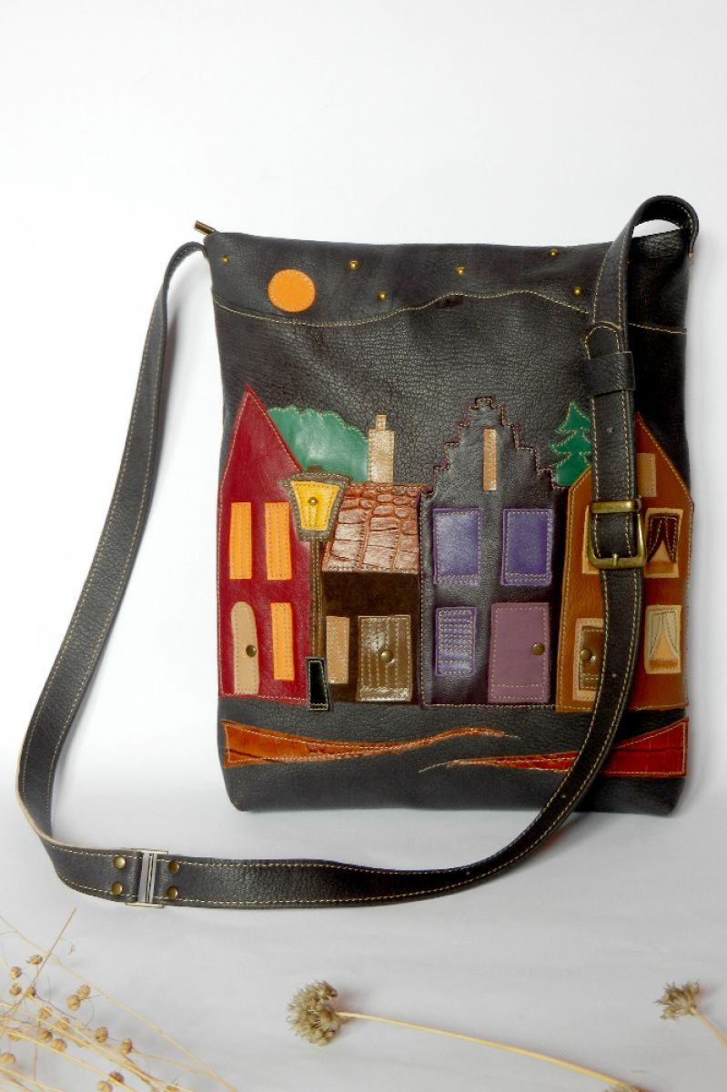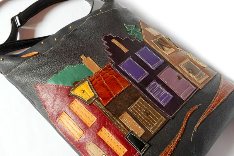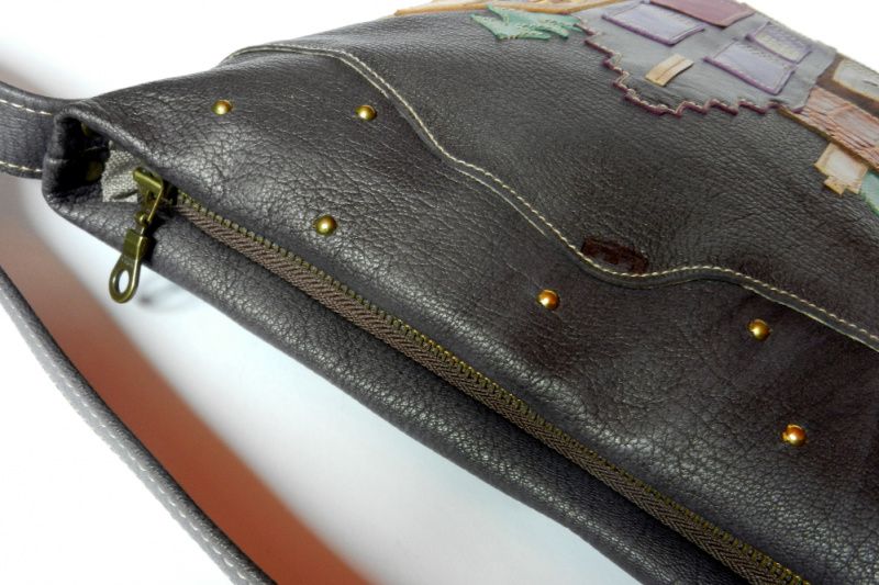 Шкіряна сумка з аплікацією з натуральної шкіри. Шкіра щільна виробництва Італії. Сумка досить містка (поміщається папка формату А4). Закривається на блискавку. Довгий регульований ремінь дозволяє носити сумку на плечі і через тіло. Усередині текстильна підкладка. Є містка кишеня на блискавки. Точне повторення неможливе.