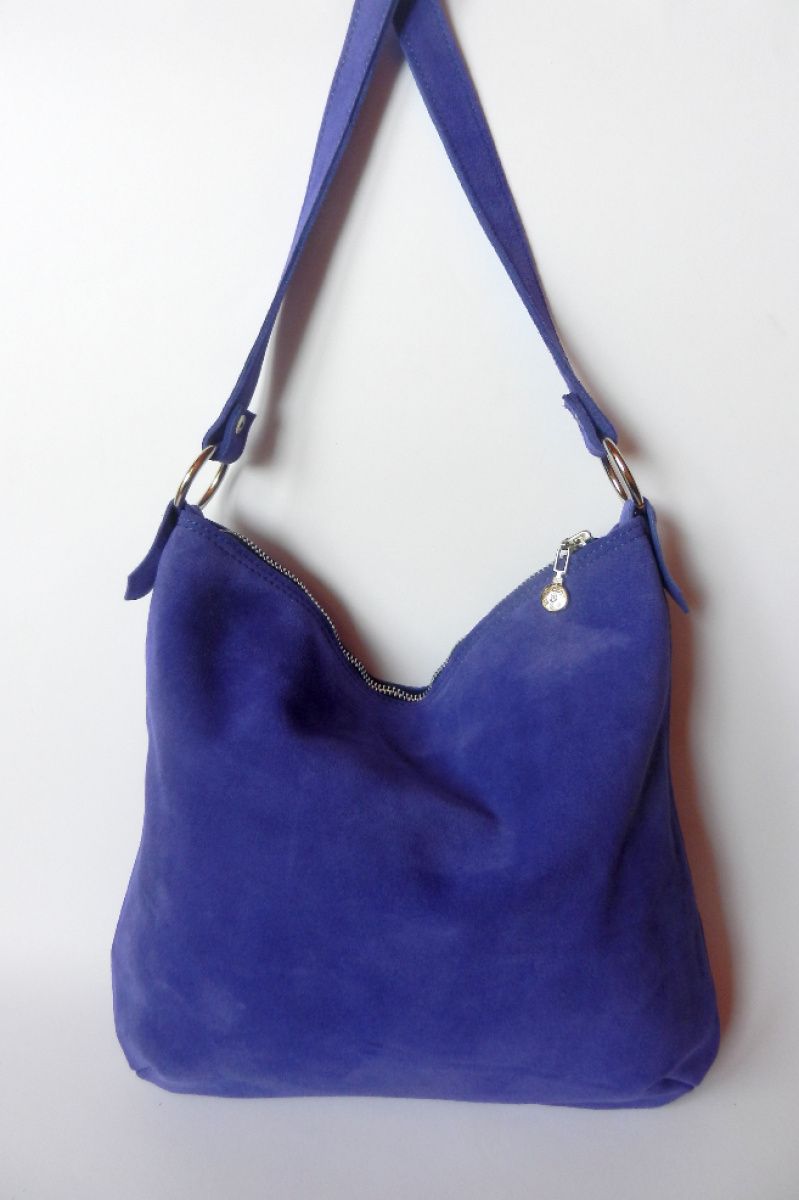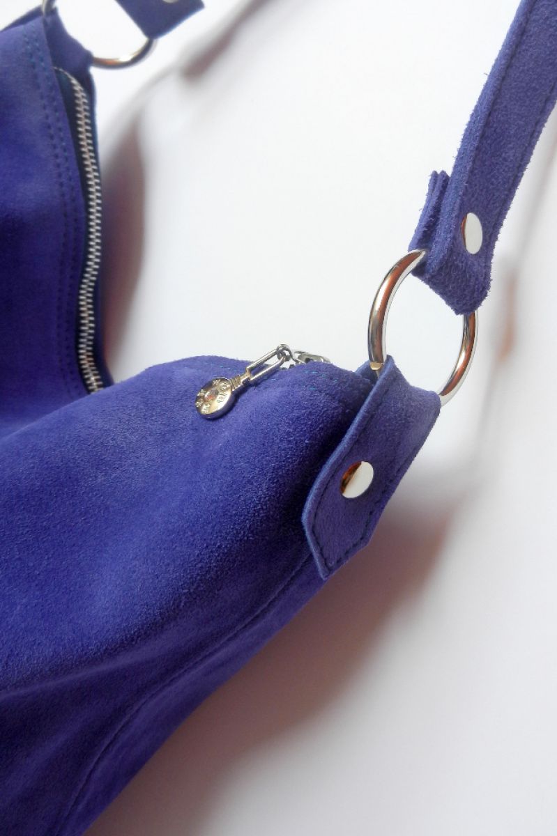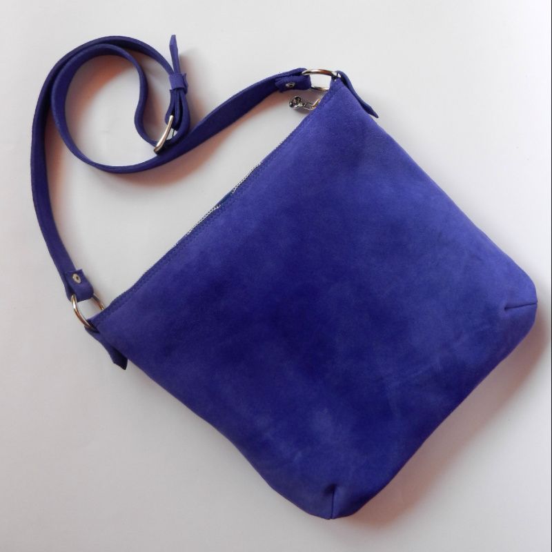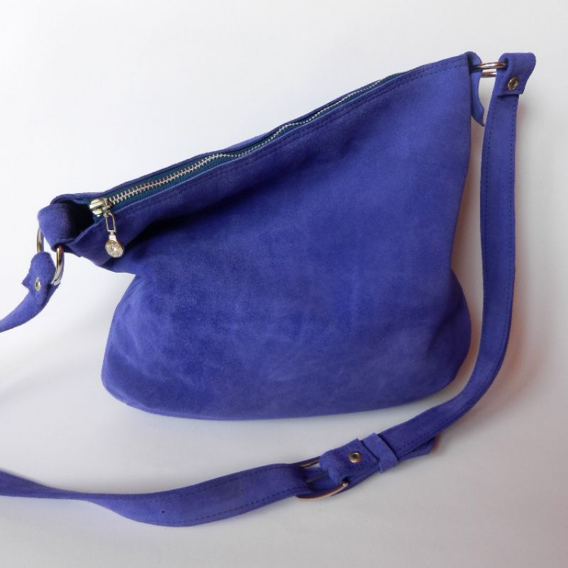 Сумка з натурального велюру шикарного волошкового кольору з природними складочками-потертостями. Якісна фурнітура кольору нікель. Застібка – блискавка. Довжина ременя регулюється за допомогою пряжки. Усередині бавовняна підкладка з метеликами. Є велика кишеня на блискавці.