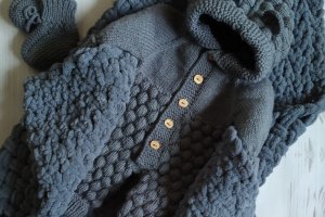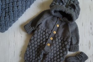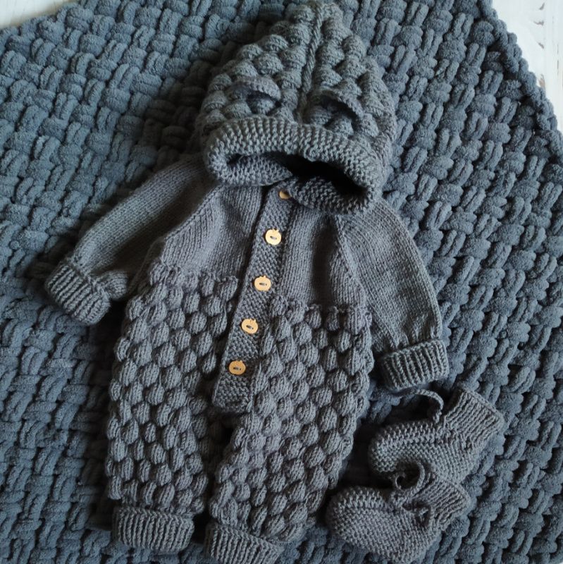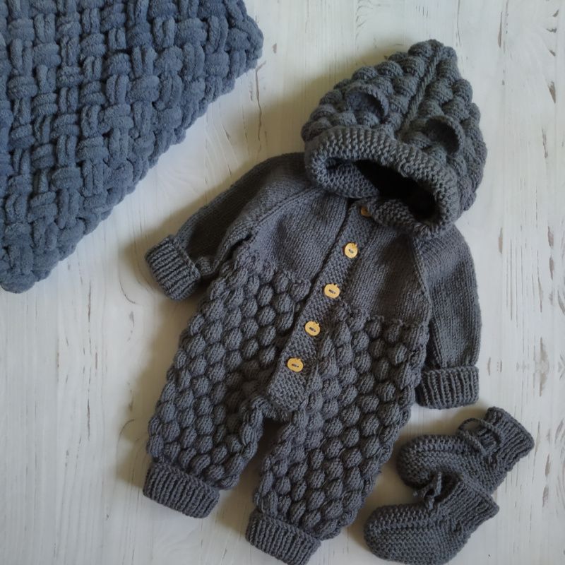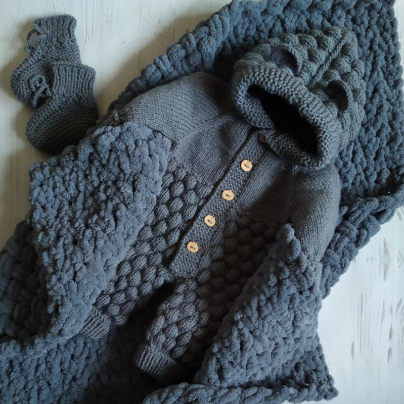 М'який та дуже стильний комплект для новородженого. Плед 85*85 см, комбінезон 56-62, пінетки в подарунок. Можна ще доповнити шапочкою. Нитка напівшерстяна.