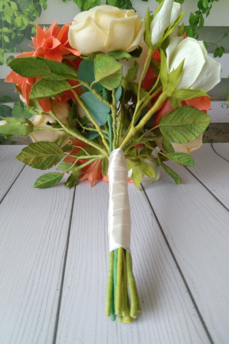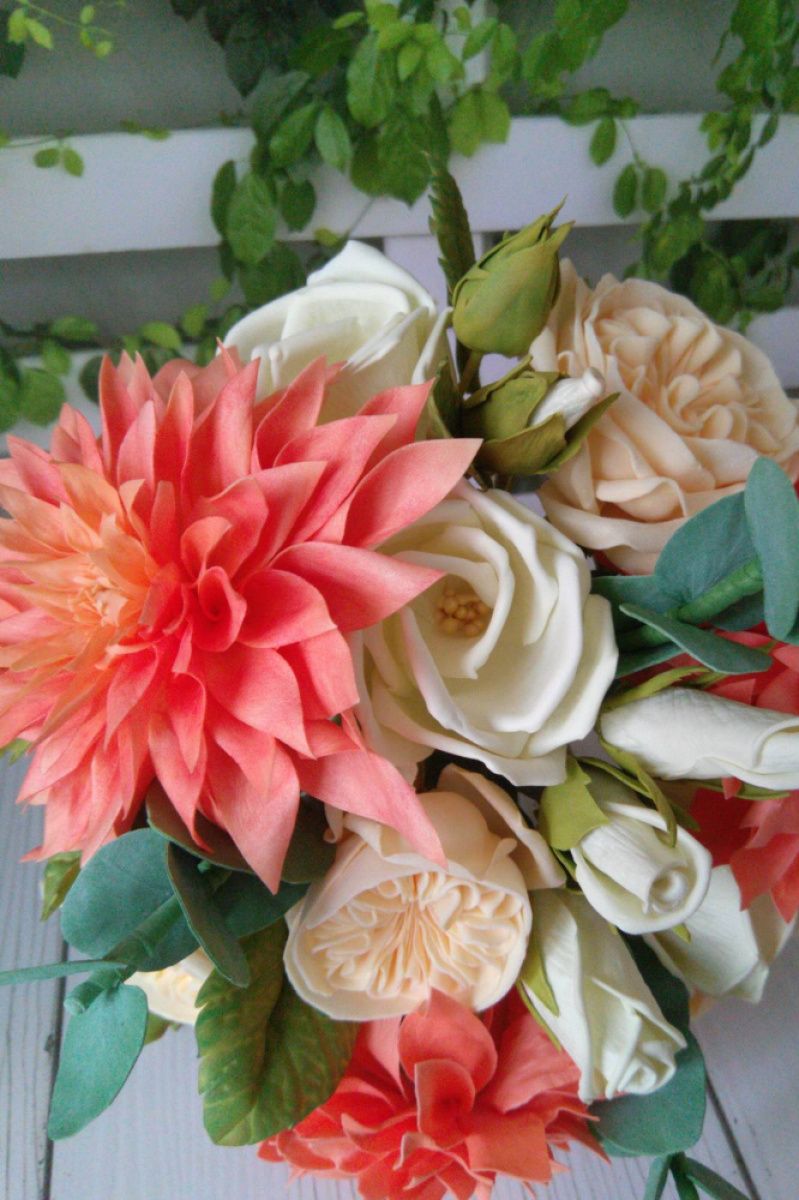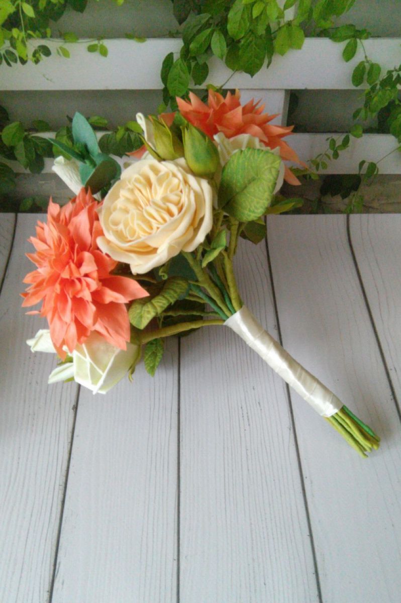 Ніжний і розкішний букет з фоаміранових квітів. Помітним плюсом є те що він не зів′яне і буде радувати вас своєю красою і взимку, і влітку. А основним плюсом є те що і після весілля букет гармонійно доповнить інтер′єр і майже не відрізнятиметься від справжніх квітів. Букет складається з жоржин, піоновідние троянд, еустом і евкаліпта. Можна також виготовити букети меншого розміру, для дружок.