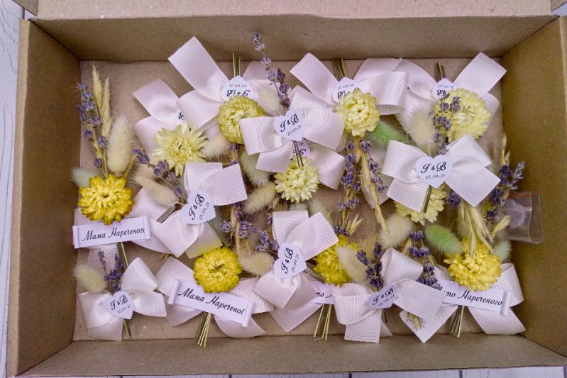 Особливі бутоньєрки для гостей з ініціалами молодих та датою весілля від майстерні Eiff. Зробимо акуратно та швидко ваше замовлення. Ціна вказана за одну бутоньєрку! Кожна бутоньєрка кріпиться на брошку. Це надійно та безпечно навіть для дітей. Можливе виготовлення на замовлення інших весільних атрибутів (бутоньєрки для наречених, подушечка для кільця, свічки, келихи, букети...)