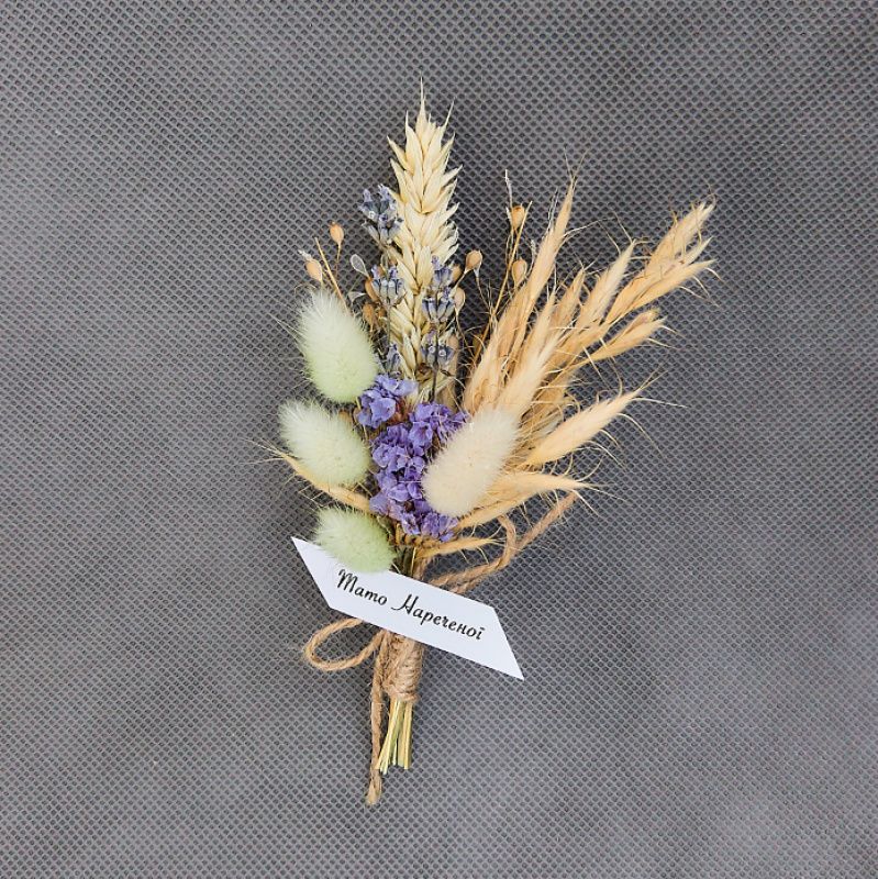 Бутоньєрки на весілля від майстерні Eiff. Зроблені з натуральних сухоцвітів. Кожна бутоньєрка кріпиться на брошку. Це надійно і безпечно навіть для дітей. Ціна вказана за одну бутоньєрку! Можливо виготовлення на замовлення в інших кольорах, а також виконання інших весільних атрибутів (бутоньєрки для молодят, подушечка для кілець, свічки, келихи, букети ... Матеріали: шпагат, колоски, лагурус.