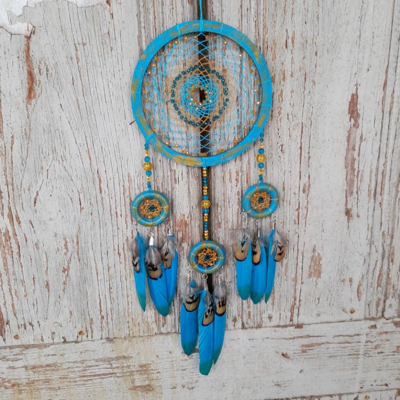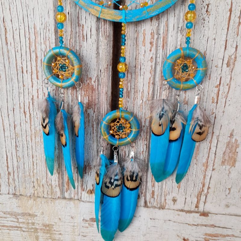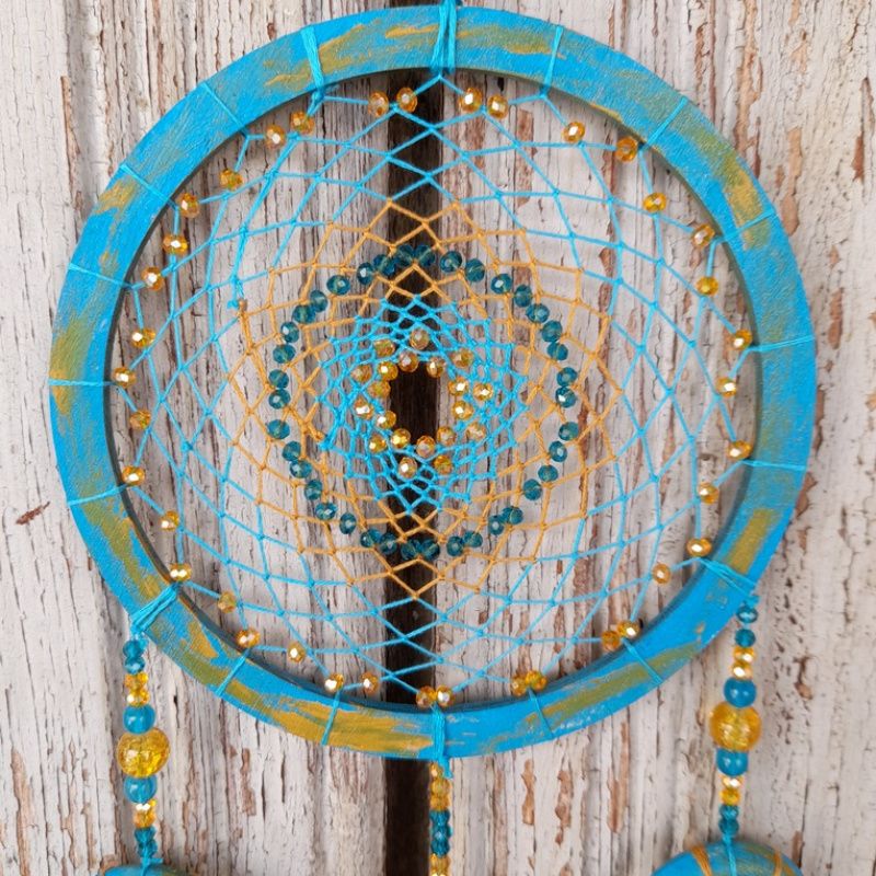 Ловець снів Золото у небі виготовлений на дерев’яній основі, розписаній акриловими фарбами та оздоблений скляними кришталевими намистинами, пір’ям гуся та королівського фазана.