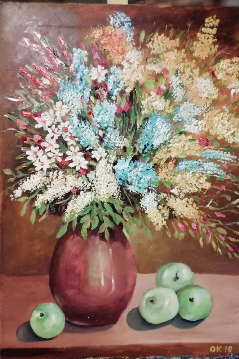 Картина "Букет квітів у вазі і яблука", олія, полотно на підрамнику, мастехін, розмір 50х70 см