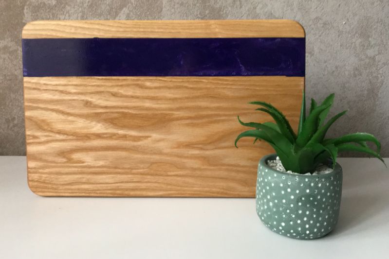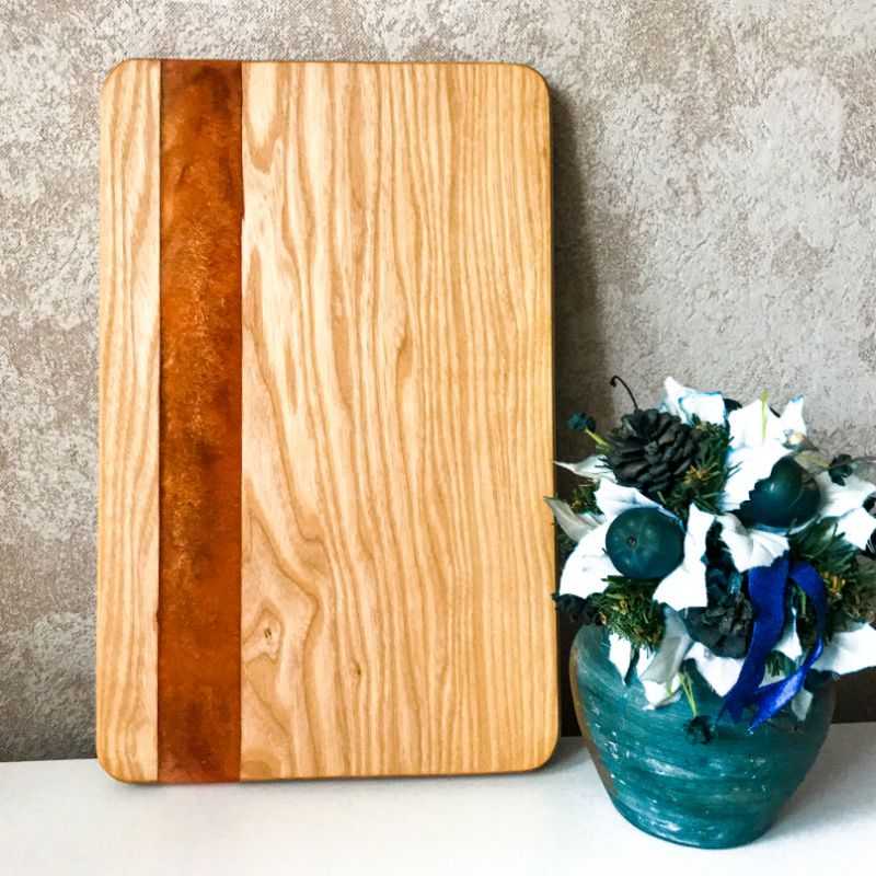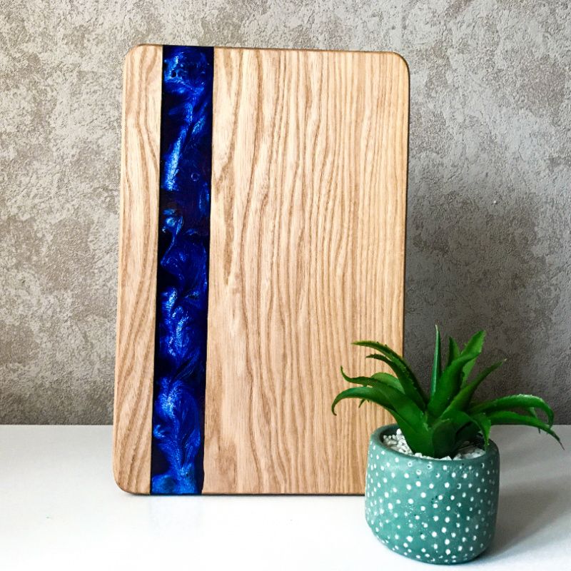 Дошка з епоксидної смоли «Sky Line» Абсолютно нова дошка в різній колірній гаммі. Головне завдання в даному проекті це поєднання таких параметрів, як компактність, практичність і зовнішній вигляд. Причому для нарізки і відбивання м'яса можна використовувати не тільки лицьову, а й задню сторону, де немає смоли взагалі. Назва говорить за себе, поєднання стандартного і перламутрового кольору це щось, з урахуванням можливості підбору під кухню - це ідеальне рішення. Ми вирішили піти далі, ніж наші конкуренти і приділили особливу увагу дрібницям. По-перше, наші дошки - це цілісний елемент ясена, а не якась там клеєна сосна. По-друге: заокруглені по всьому периметру, що покращує естетичний вигляд. Заливка зроблена не наскрізь оскільки це не надійно в плані використання товщина її становить 10 мм. Виріб вже покрито спеціальним маслом і готово до використання. Відправка дошки здійснюється в нестандартній коробці, з наповнювачем ідеальний варіант, якщо ви купуєте годинник на подарунок. Забрали на пошті - подарували. Тепер не потрібно окремо купувати подарунок, потім стояти в чергах, для його упаковки! Чи можемо виготовити на замовлення будь-який колір, форма, розміри.