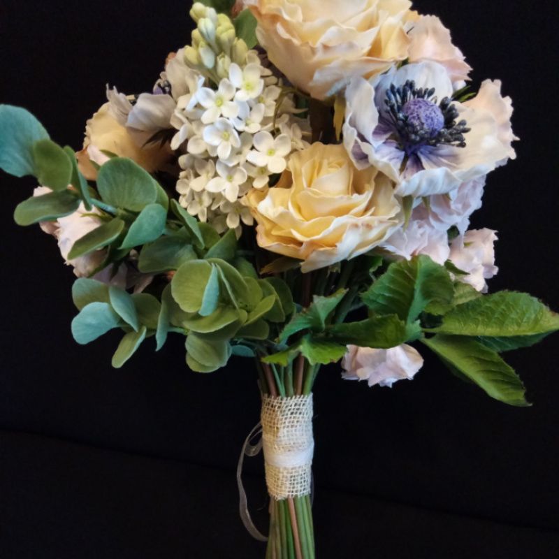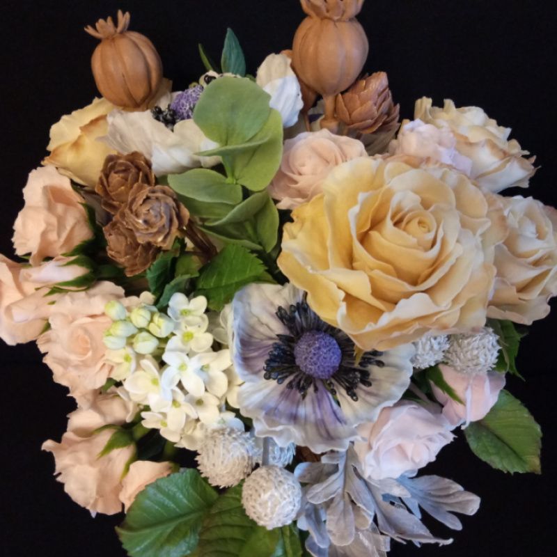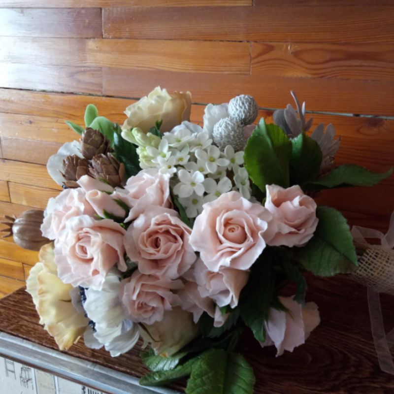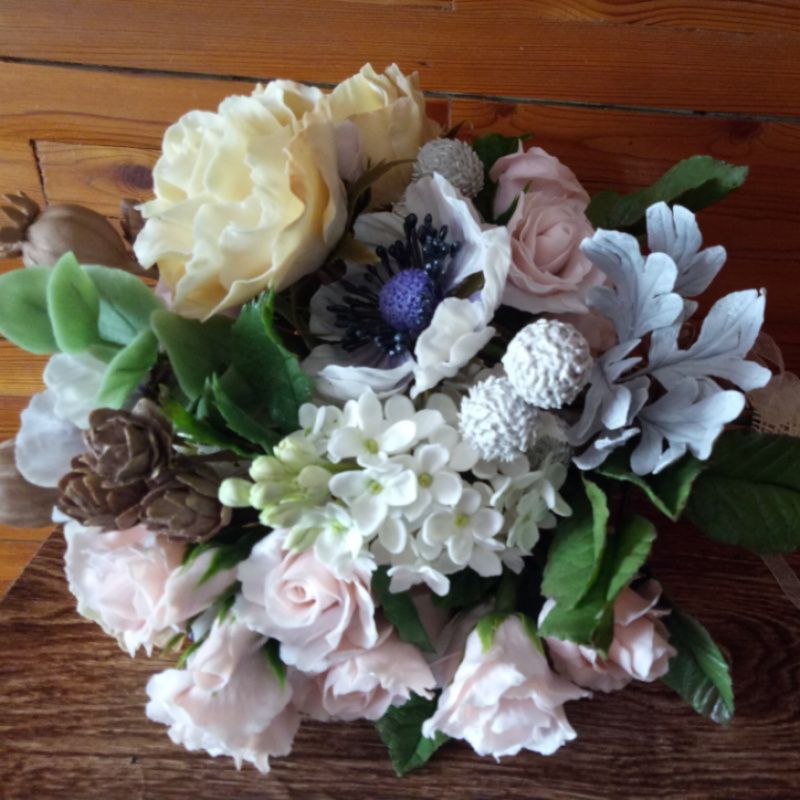 Букет квітів виконаний з холодного фарфору (полімерна глина). Дуже соковиті кольори цих, ніколи не в'януть квітів, прекрасно доповнить будь-який інтер'єр, надавши йому особливий шарм і затишок. Прикрасить столик, комод, тумбочки або підвіконня. У складі: гілочки бузку, кущова троянда, садові троянда, білий мак, макові коробочки, маленькі шишки, Бруно, гілки евкаліпта, листя троянди. Цей букет виконаний на замовлення і пропонується вашій увазі, як приклад. Замовлення виконується протягом 7-10 днів.