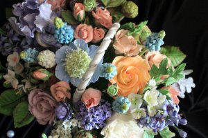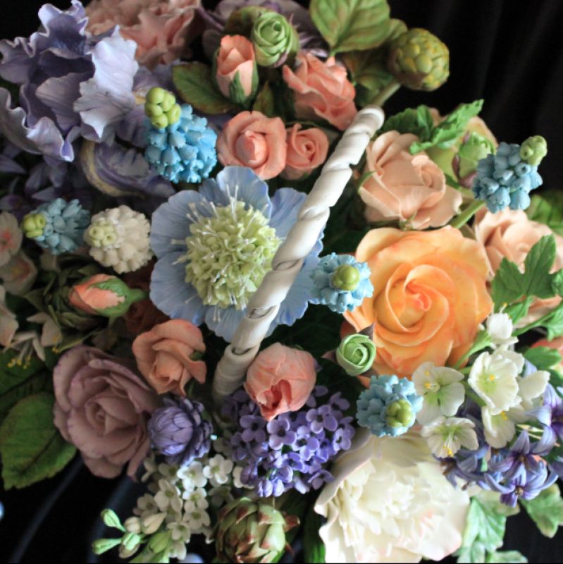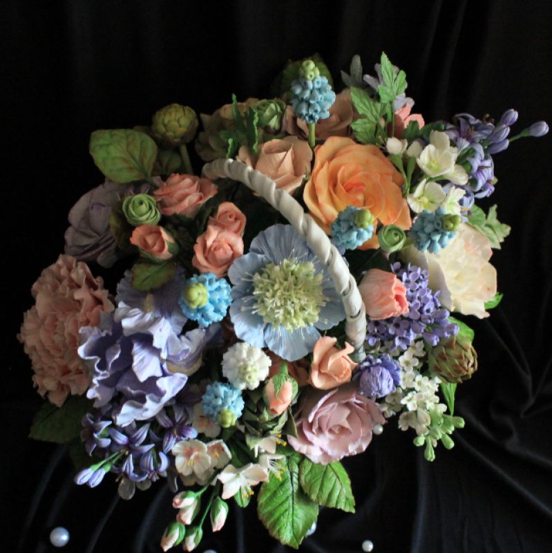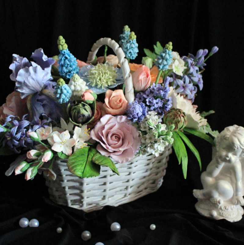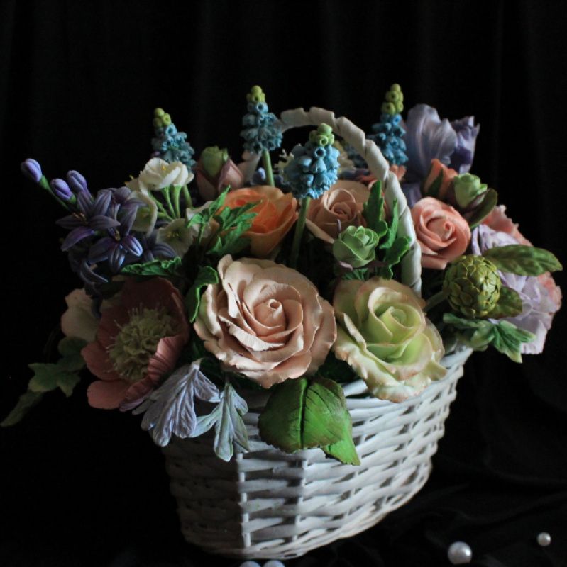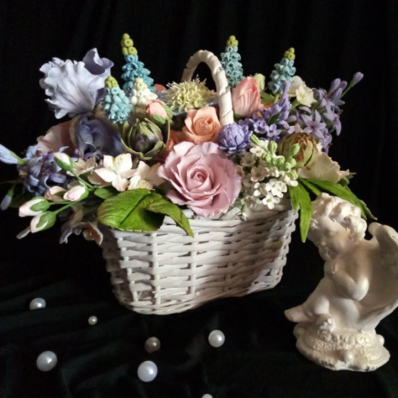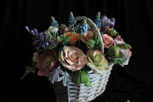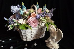 Букет квітів виконаний з холодного фарфору (полімерна глина). Дуже соковиті кольори цих, ніколи не в'януть квітів, прекрасно доповнить будь-який інтер'єр, надавши йому особливий шарм і затишок. Прикрасить столик, комод, тумбочки або підвіконня. У складі: троянди, скабіоза, гілочки бузку, мускарі, гілочки квітучої яблуні, ірис, кущова троянда, шишечки, листя троянди, плюща полин Стеллера. Цей букет виконаний на замовлення і пропонується вашій увазі, як приклад. Замовлення виконується протягом 10-12 днів.