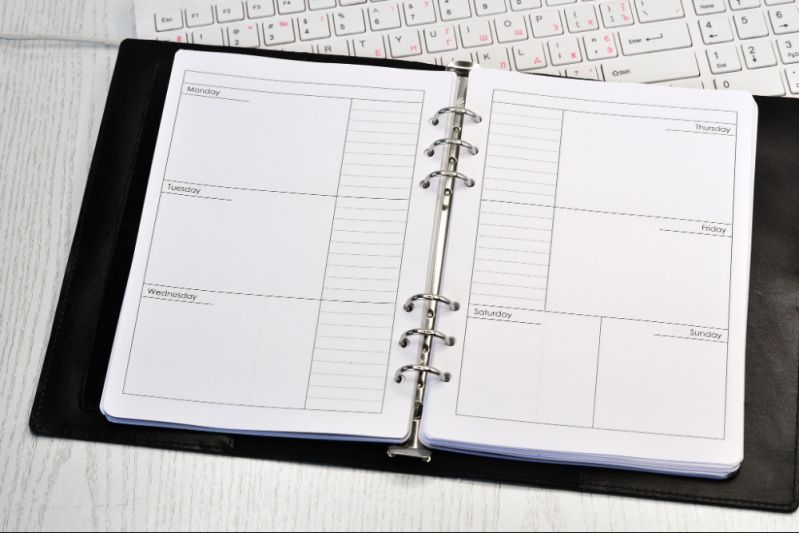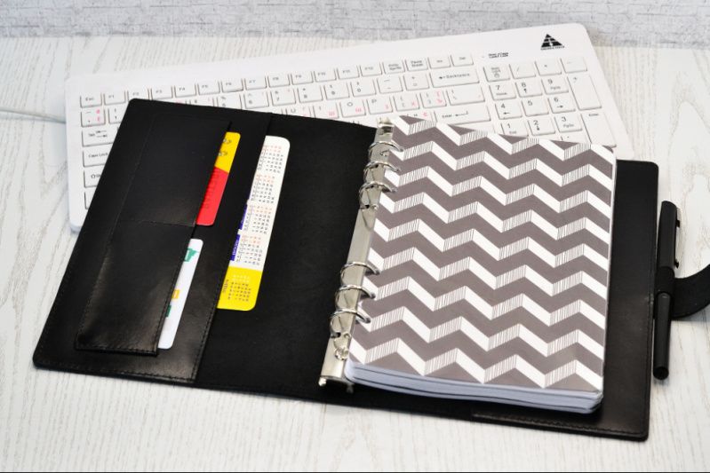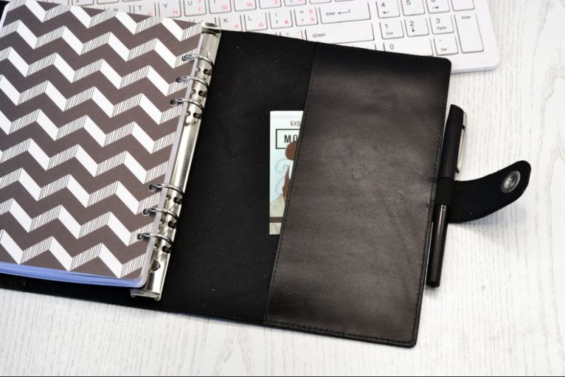 Розглянути докладніше та купити можна тут: https://plannermania.com.ua/shop/leather-planner-black-A5 Є відео. Планер у шкіряній обкладинці із кільцевим механізмом. Розмір А5. Обкладинка – дуже щільна натуральна шкіра, матова, класичного чорного кольору. На обкладинці дві вертикальні кишені і дві міні-кишені для карток або візиток. Блокнот закривається на магнітну кнопку з отвором. П а р а м е т ри ✔ Обкладинка: щільна натуральна шкіра. ✔ Розмір обкладинки: 18х24 см. ✔ Для аркушів: А5 (15х21 см). ✔ Кільцевий механізм: 2 см. ✔ Застібка: ремінець та кнопка. ✔ Папір: преміум, 90 г/см.кв, 100 аркушів, розмір 14,5х21 см. ✔ Кількість роздільників: три. Зміст ✔ календарі, ✔ розворот "Важливі дати", ✔ річний розворот, ✔ сітки на місяць (12 місяців), ✔ тижневі сітки (54 тижні), ✔ сторінки в лінію. У планері 100 аркушів преміального паперу, чотири роздільники із принтованого дизайнерського паперу, прозора ацетатна плівка на початку. Додатково можна придбати ПВХ-конверти на зип-лоці, пластикові лінійки-закладки і т.д. Планер упакований у текстильний еко-мішок. Слідкуйте за нашими новинками в Інстаграм: @planner_mania