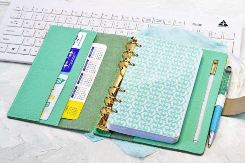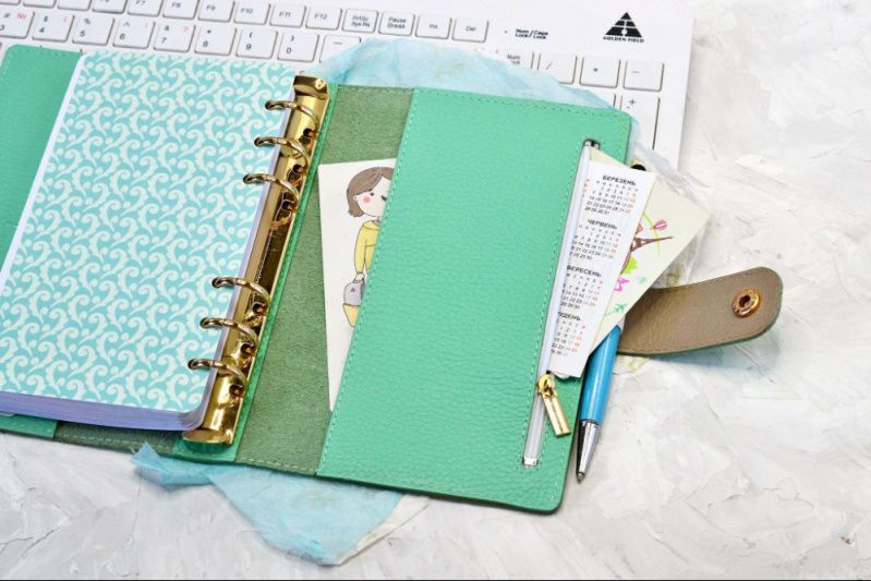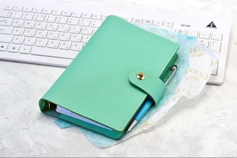 Переглянути детальніше та купити можна тут: https://plannermania.com.ua/shop/classic-mint-personal Можливе відео. Блокнот/планер/щоденник в обкладинці із натуральної шкіри флотар свіжого м'ятного кольору. Фурнітура – золотий колір. П а р а м е т ри ✔ Обкладинка: натуральна шкіра. ✔ Розмір обкладинки: 13х19 см. ✔ Розмір листів: 9,5х17 см. ✔ Розмір кілець: 2 см. ✔ Кількість листів: 100. ✔ Папір: преміум, 90 г/см.кв. ✔ Кількість роздільників: 4. Сторінки цього блокноту я надрукую спеціально для вас, є як датовані, так і недатовані варіанти. На фото наведено сторінки лише для прикладу. На ваше бажання замість щоденника я можу поставити в блокнот листи в лінію або крапку. У блокноті чотири роздільники з дизайнерського картону, прозорий ацетатний лист на початку щоденника. На обкладинці П'ять кишень, одна з яких закривається на блискавку. Додатково можна придбати ПВХ-конверти на зип-лоці та без нього, пластикові лінійки-закладки тощо. Слідкуйте за нашими новинками в Інстаграм: @planner_mania