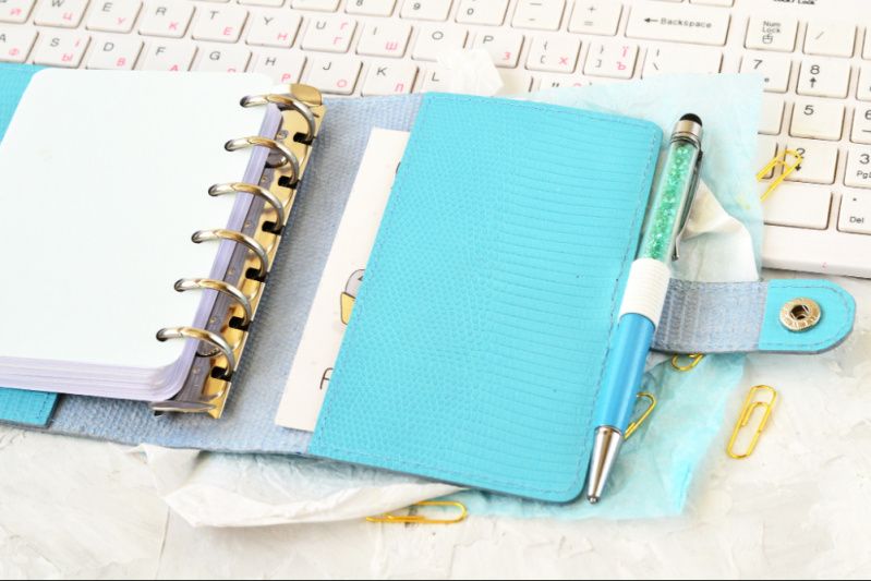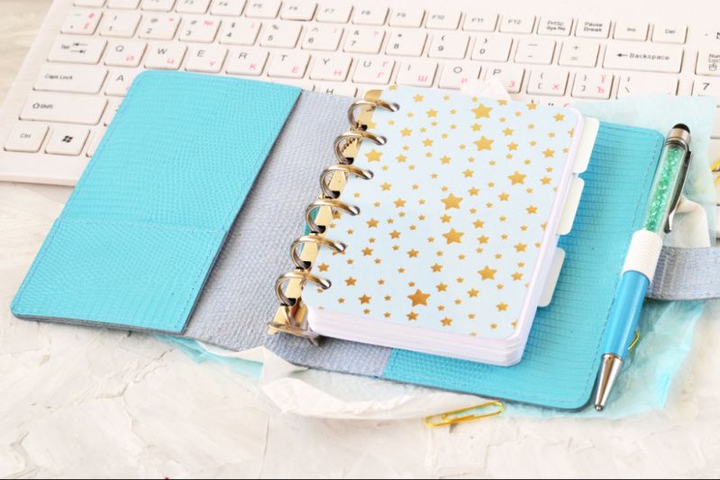 Розглянути докладніше та купити можна тут: https://plannermania.com.ua/shop/leather-planner-blue-pocket Шкіряний планер на кільцевому механізмі формату Pocket (сторінки 8,1 х12 см). Шкіра на обкладинці не товста, але досить жорстка, добре захищає листи. Колір - ніжно-блакитний, з невеликим лаковим блиском, має гарне тиснення під ігуану. На обкладинці три кишені. Закривається на металеву кнопку. П а р а м е т ри ✔ Матеріал обкладинки: натуральна шкіра. ✔ Розмір обкладинки: 10,5 х14, 5 см. ✔ Сторінки: 8,1 х12 см (формат Pocket). ✔ Кільцевий механізм: 6 кілець, діаметр 2 см. ✔ Папір: 90 г/см.кв. ✔ Додатково: три роздільники та форзац з фольгуванням. У планер вставлений блок з макетом "тижневик", до якого додані додаткові сторінки - трекери на весь рік. Папір підвищеної білизни та щільності (90 г/см.кв.), це не офісний папір! У блокноті три розділювачі з перлинно-блакитного дизайнерського картону з гарним перламутровим відливом, додатковий форзац із фольгуванням та прозорий ацетатний лист на початку. Слідкуйте за нашими новинками в Інстаграм: @planner_mania