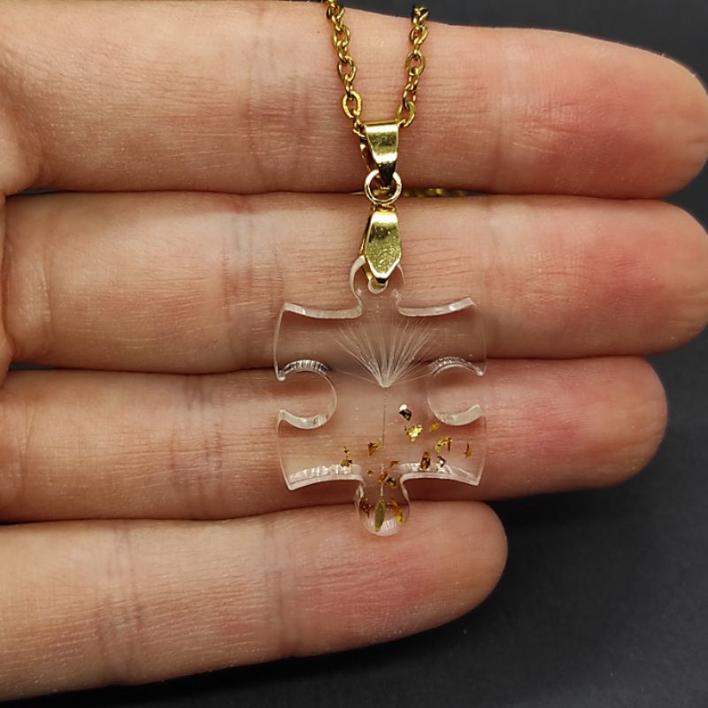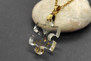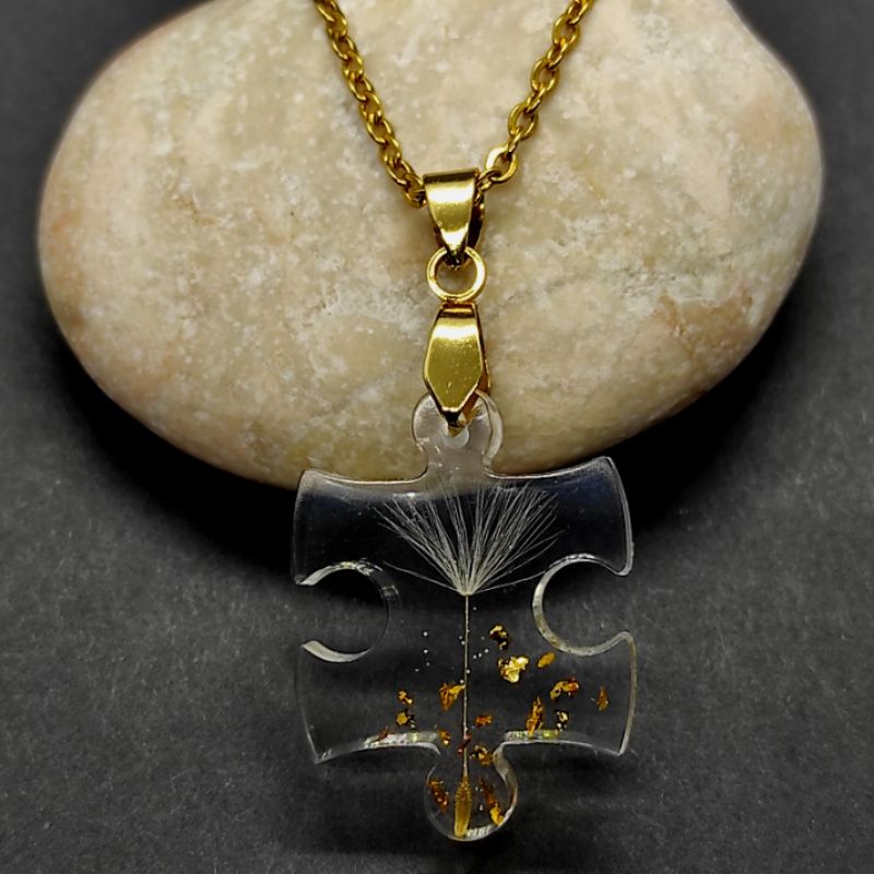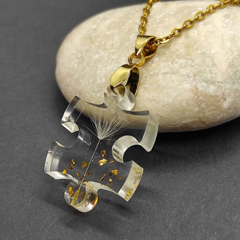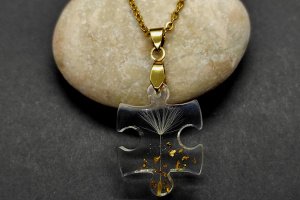 Кулон ручної роботи виконаний з ювелірної смоли високої якості і натуральної кульбабки з додаванням сусального золота.