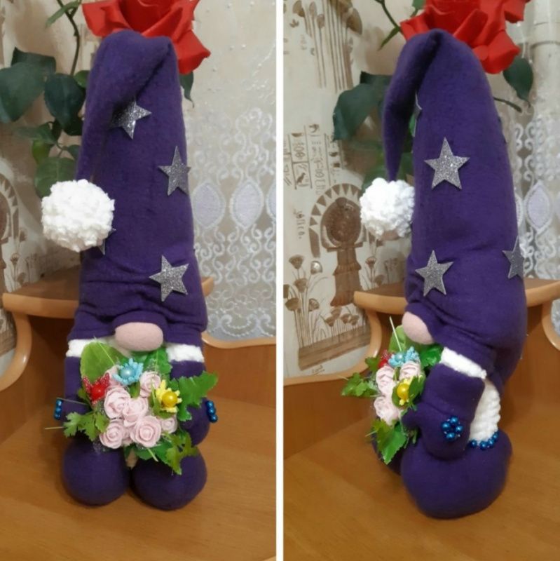Гном з букетом квітів ручної роботи. Зріст 28см. Зроблений акуратно та з любов'ю. Готовий до переїзду до нового будинку:)