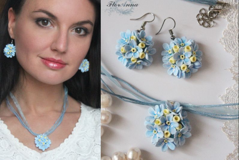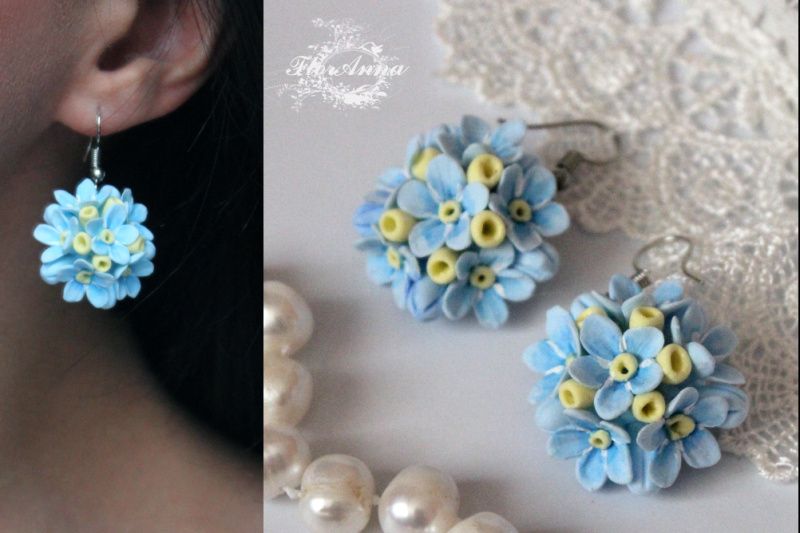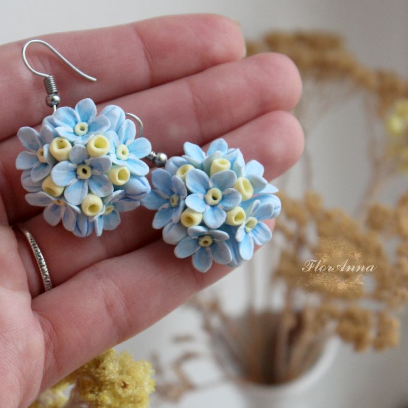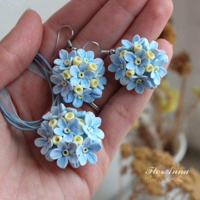 Назва квітки говорить сама за себе: не забувай, будь вірний, пам'ятай. Відомо, що незабудка – це символ сталості та вірності. Ми вирішили створити неймовірно ніжний комплект із небесними незабудками. Квіти розміщуються по колу, створюючи повітряну композицію. Кожна квіточка зліплена вручну і розписана акриловими фарбами. Прикраси дуже легкі, практично невагомі. Діаметр композицій 2,5 см Можна зробити ще шпильку, обідок або браслет