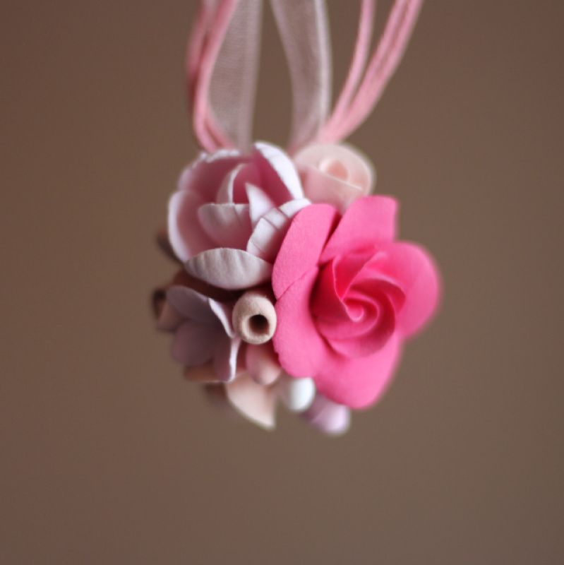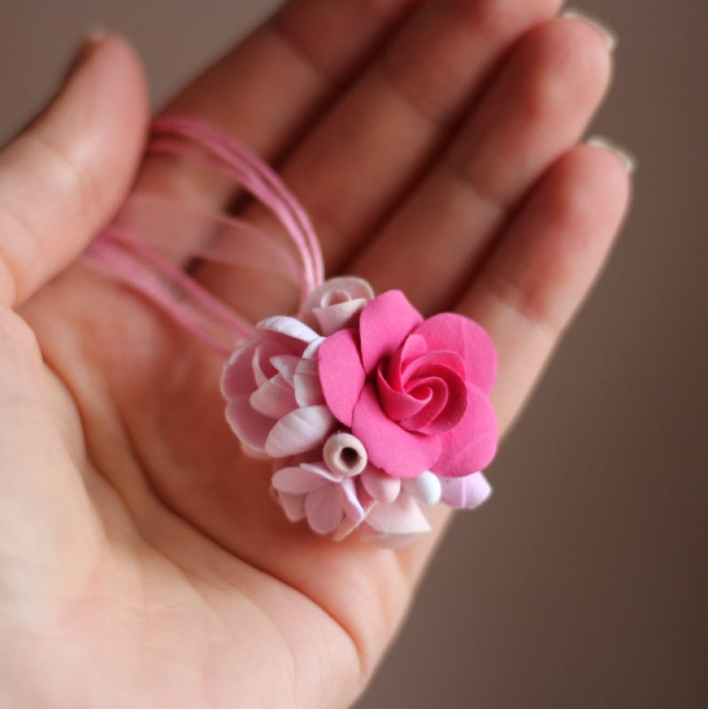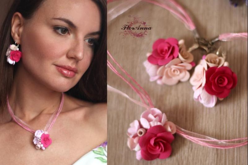 Рожевий комплект прикрас із квітами із полімерної глини для незабутнього образу. Композиція складається з троянд та півончиків. Кожна квіточка зліплена вручну з полімерної глини decoclay.