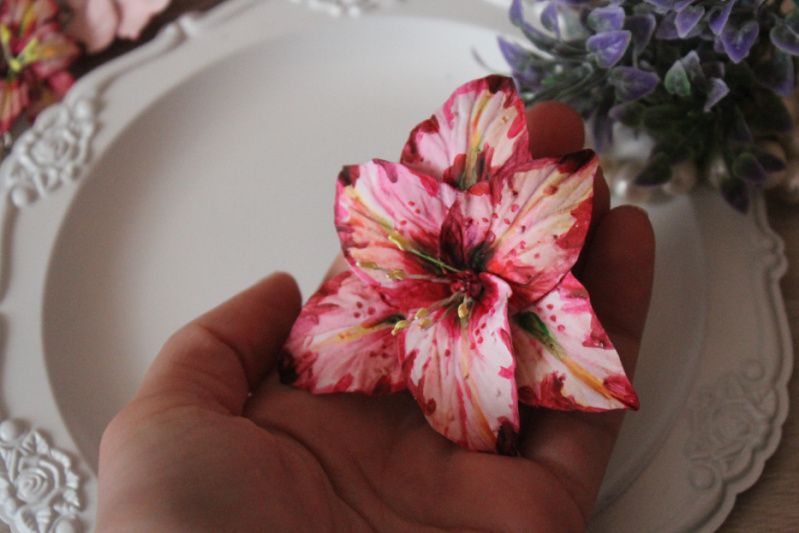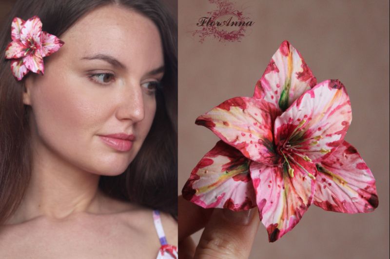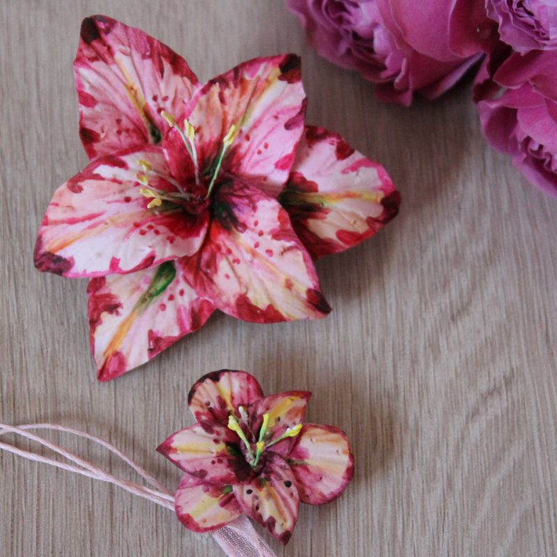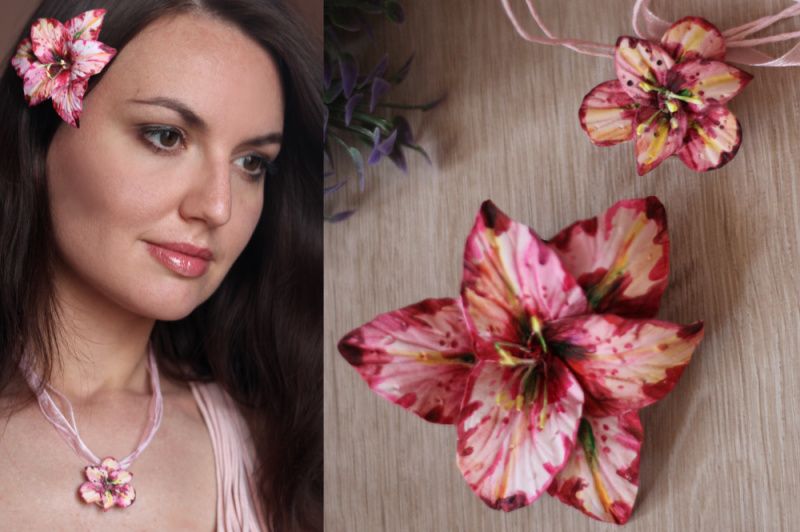 Комплект прикрас із квітами з полімерної глини "Тигрові лілії" для яскравого образу. Якщо ви любите незвичайні квіти, тигрові лілії це те, що Вам потрібно. Кожна пелюстка зліплена вручну з дуже легкої полімерної глини decoclay. Квіти з оригінальним акриловим розписом неможливо відрізнити від живих.