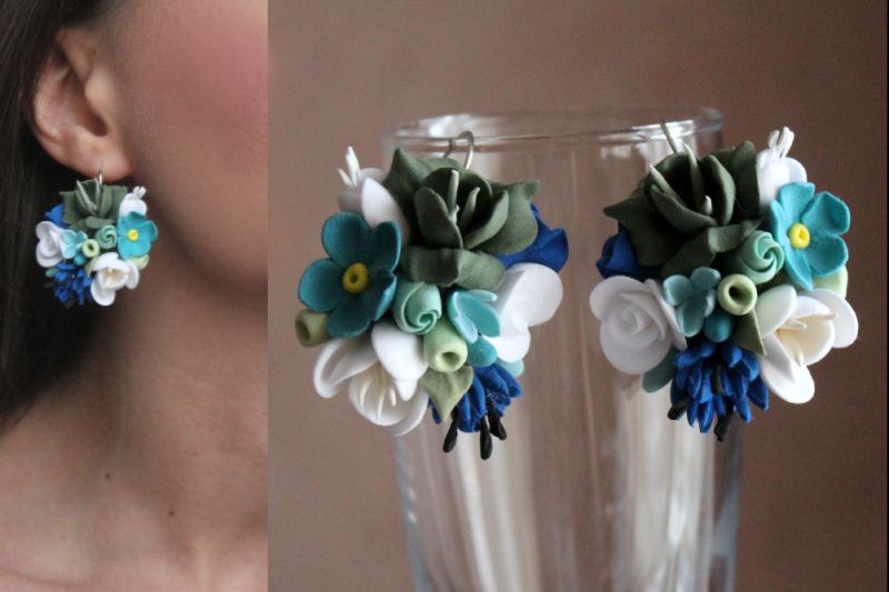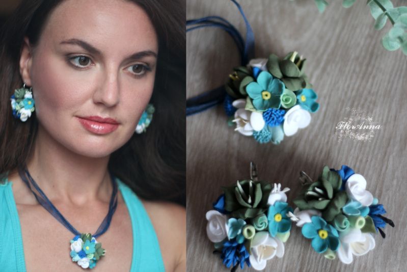 Стильний, шикарний та незвичайний комплект зробить образ незабутнім. Композиція поєднує різні кольори, тому сережки підійдуть під будь-яке вбрання. Комплект складається з фрезій, троянд, незабудок та волошок. Наші квіти створені з японської полімерної глини decoclay. Квіти дуже легкі, майже невагомі.