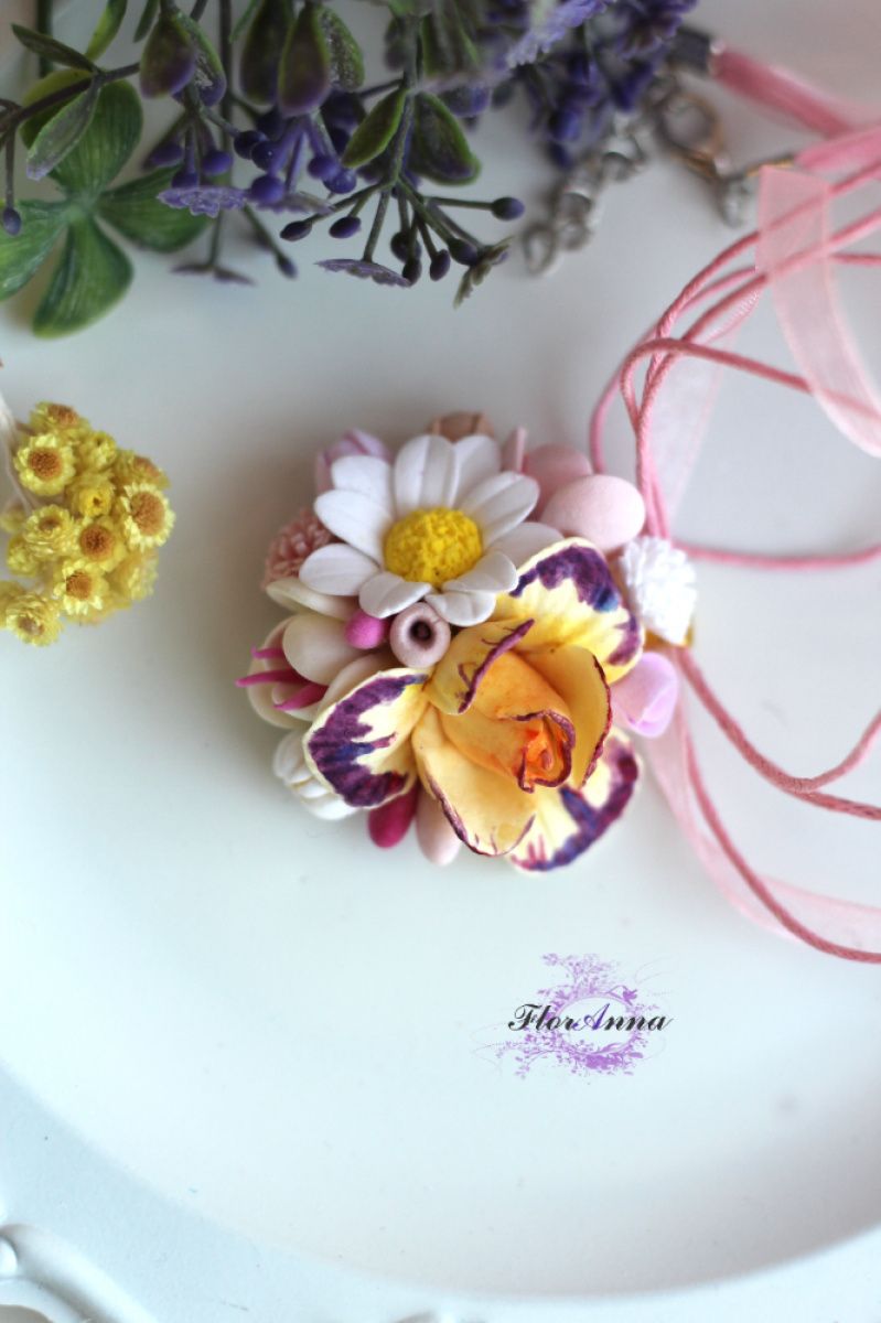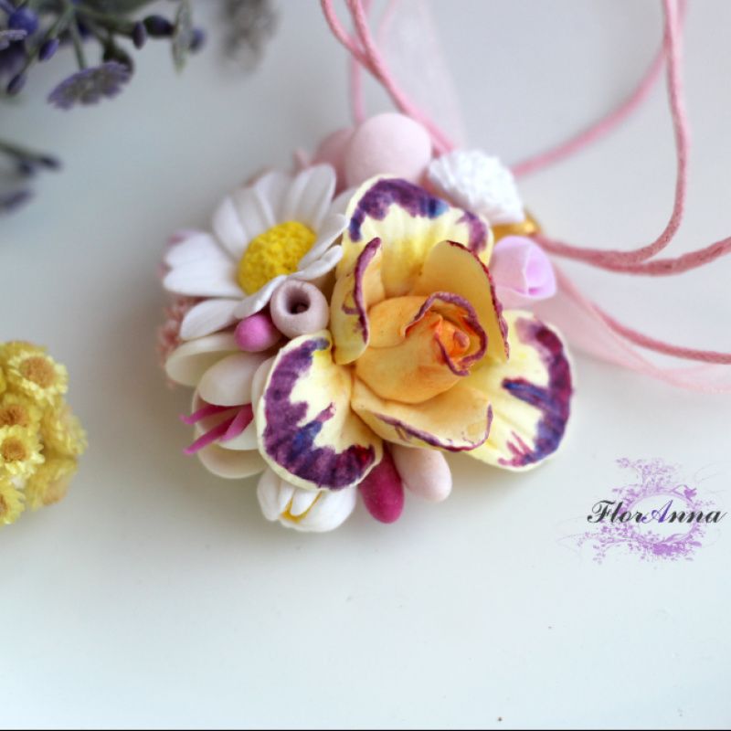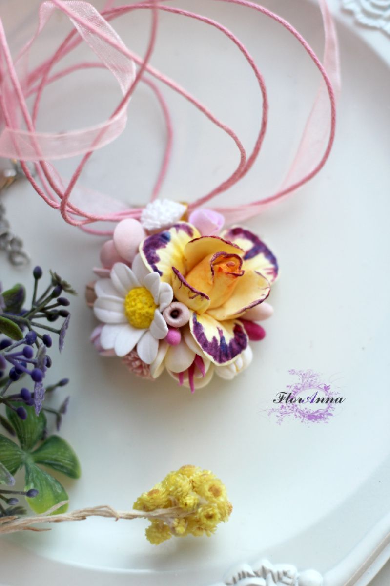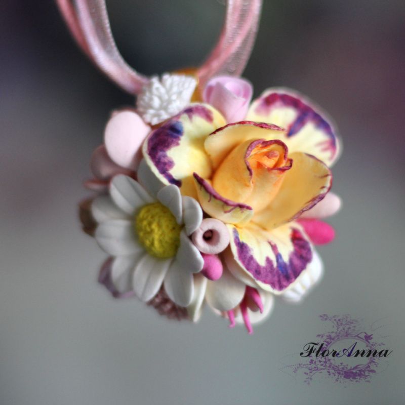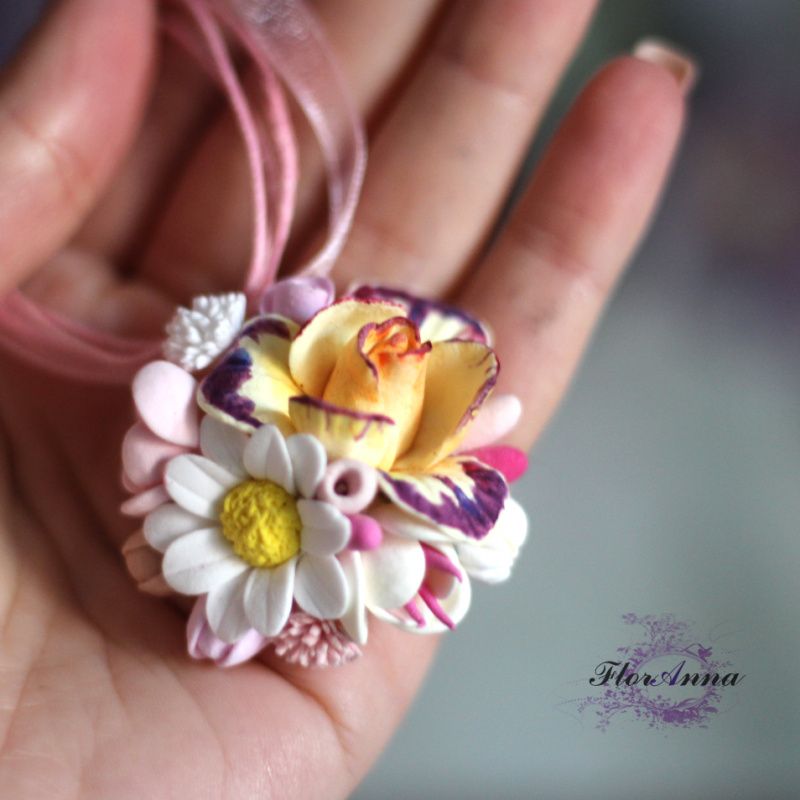 Яскравий та стильний кулон ручної роботи для сонячного настрою. Композиція складається з ірису, ромашки, фрезій та різноманітних бутончиків. Колірна гама дуже приємна та яскрава. Кожна квіточка зліплена вручну з дуже легкої полімерної глини. Розмір 4,5 см Загальна довжина мотузочки 40 см + 4 см ланцюжок Під кулон можливі: сережки, браслет, шпилька, брошка. Є питання? Пишіть повідомлення
