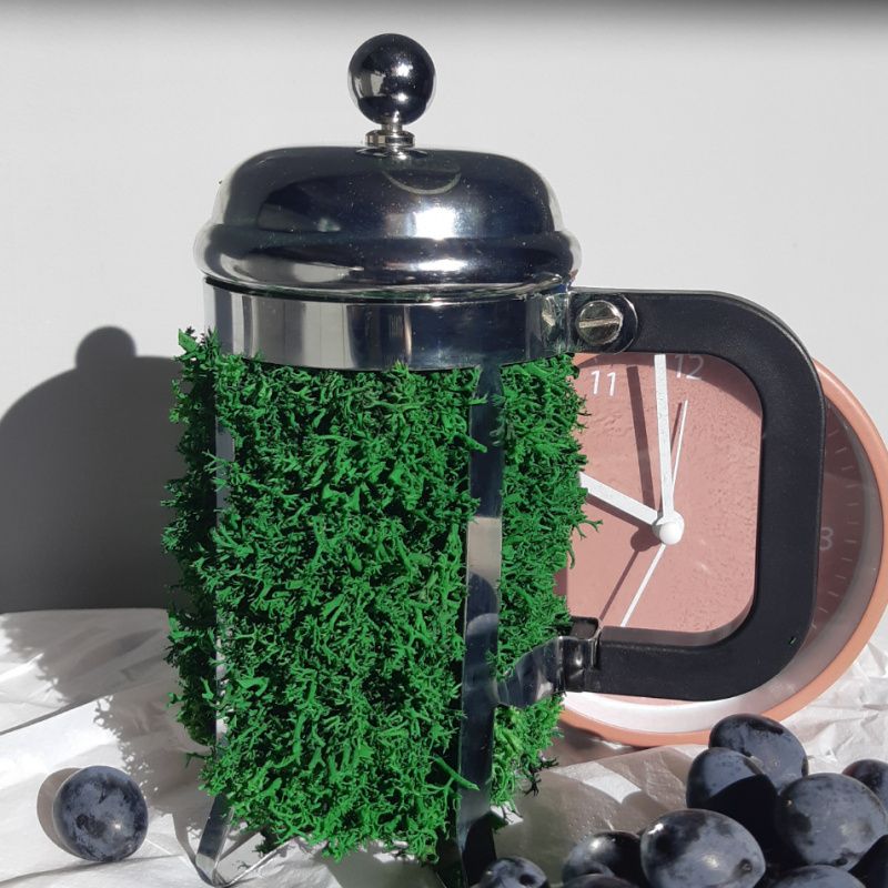 Декоративний чайник зі стабілізованим мохом. Авторська робота. Може використовуватися тільки в якості декору. Основа виробу металева, замість колби використаний стабілізований мох. Мох довговічний, поливу та догляду не потребує. Має вигляд і структуру живої рослини. Стабілізований гліцериновою сумішшю. Зберігає зовнішній вигляд до 8 років. Для підтримки зовнішнього вигляду стабілізованого моху необхідно підтримувати вологість повітря в приміщенні не менше 40%.