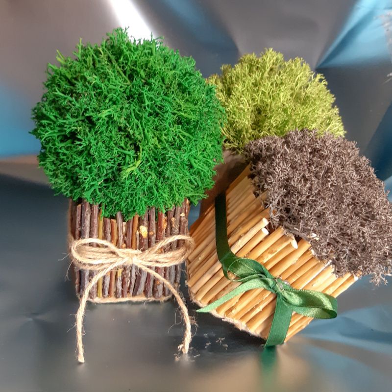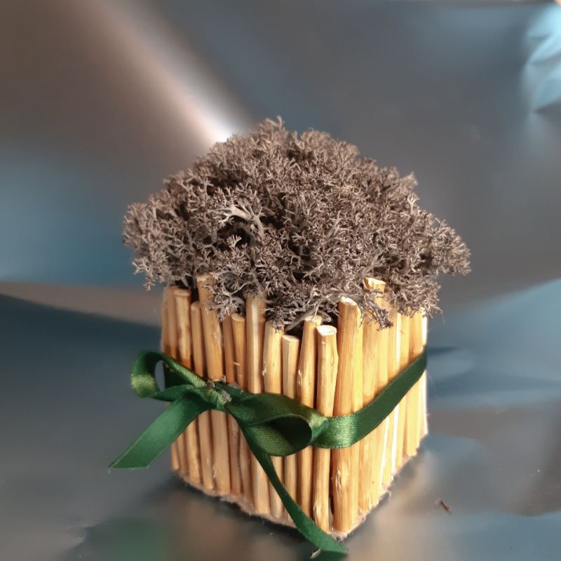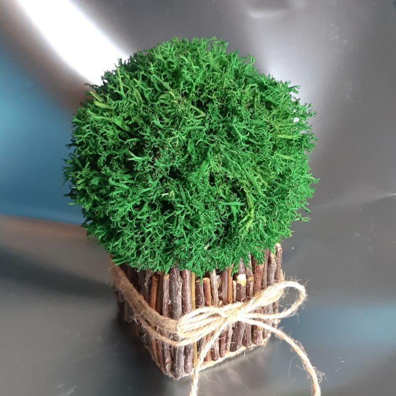 Кашпо з стабілізованою мохом може стати вдалим рішенням озеленення. Стабілізований мох - частинка живої природи, що пройшла тривалий процес обробки гліцерином. Завдяки стабілізації мох на довгі роки збереже м'якість і привабливий зовнішній вигляд. Все, що йому необхідно - захист від прямих сонячних променів і вологість повітря не нижче 40%. Кашпо виконано їх гілок. Колір моху і колір кашпо може бути підібраний за вашим бажанням.