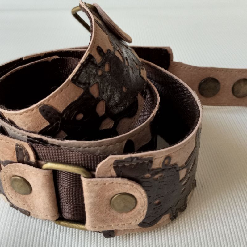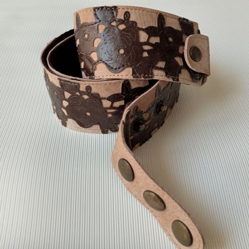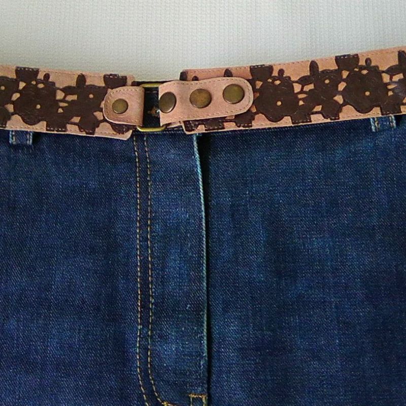 Авторська робота - ремінь ручної роботи у стилі етно. Матеріали - бежева натуральна шкіра з аплікацією з вінілової ажурної коричневої тасьми.