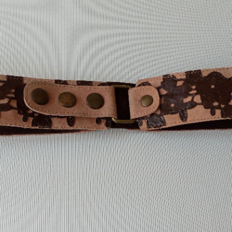 Основа - стрічка ремінна коричневого кольору. Застібка на металеві кнопки з можливістю регулювання по талії від 79 см до 82 см.
