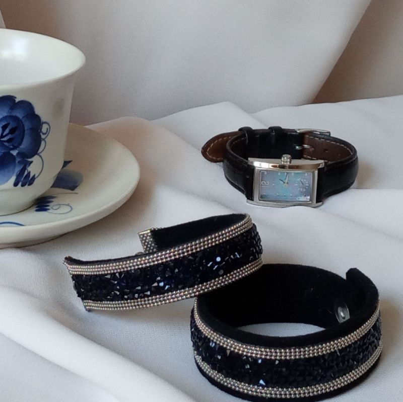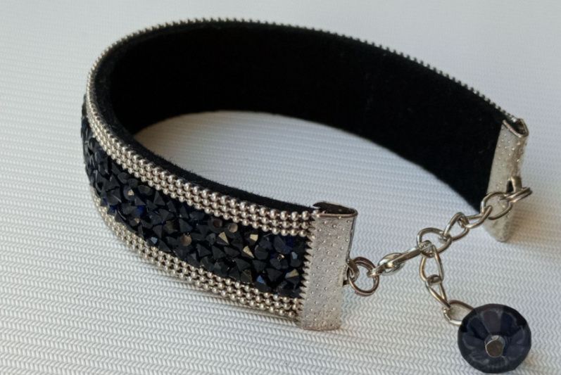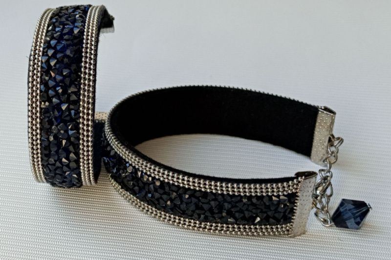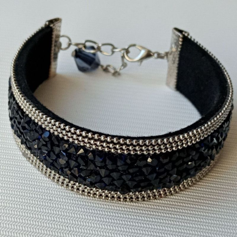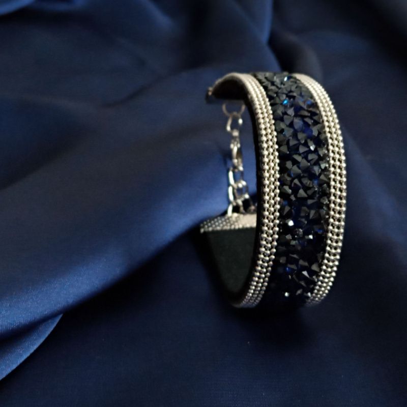 Авторська робота- вишуканий синій браслет зі стразами. Регульована металева застібка. Сучасний виріб прикрасить вашу сукню, гольф. Довжина: 16,5 - 17.5 см, ширина- 2,0 см.
