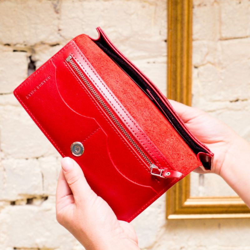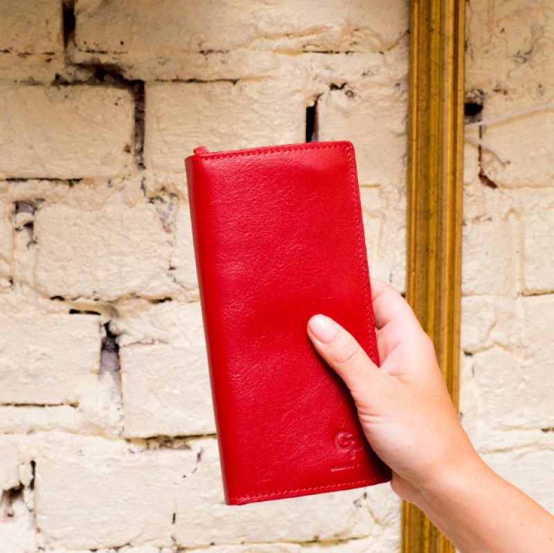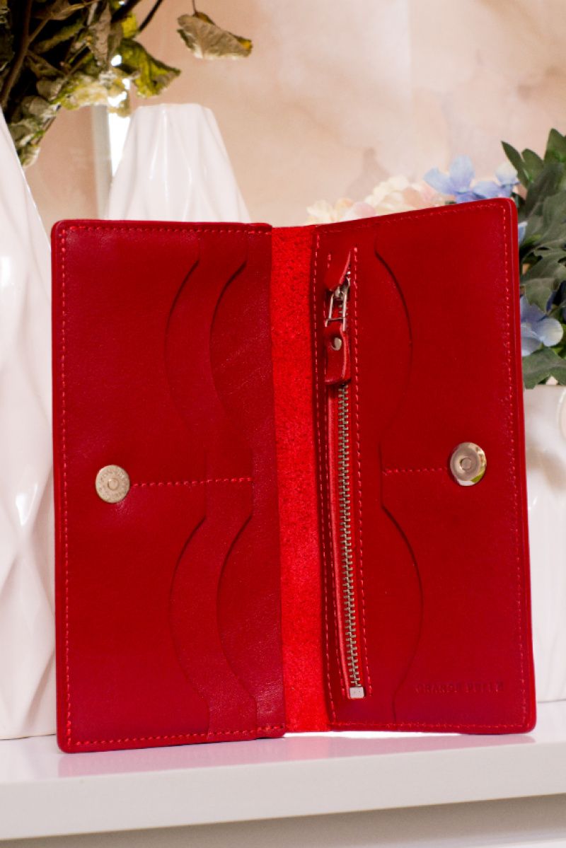 Портмоне з гладкої шкіри. Має 4 відділи під купюри, монетницю на блискавці, 6 відділень під карти. В наявності червоний, синій, чорний, коричневий кольори.