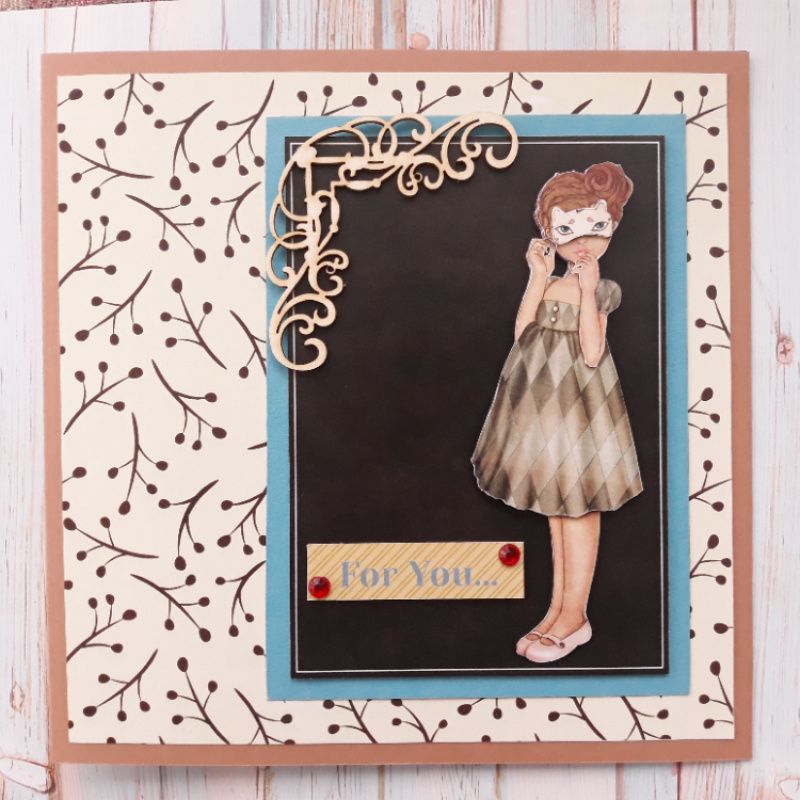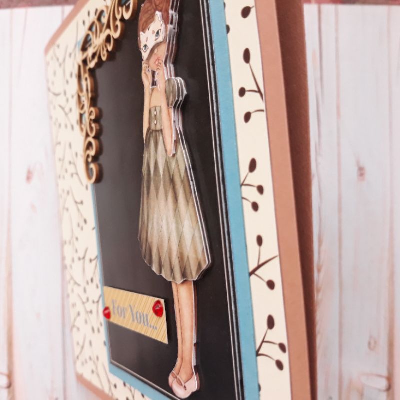 Об'ємна листівка ручної роботи, прикрашена дерев'яним елементом.