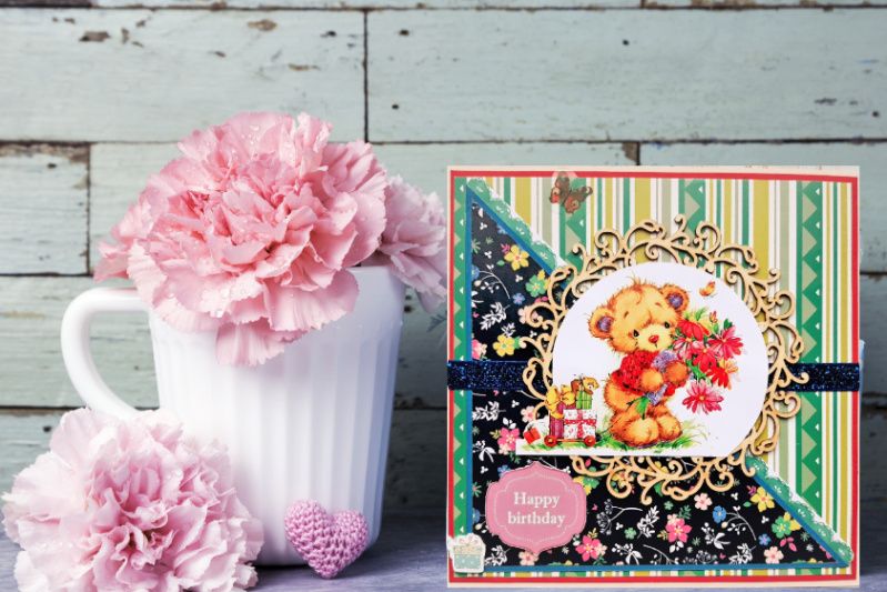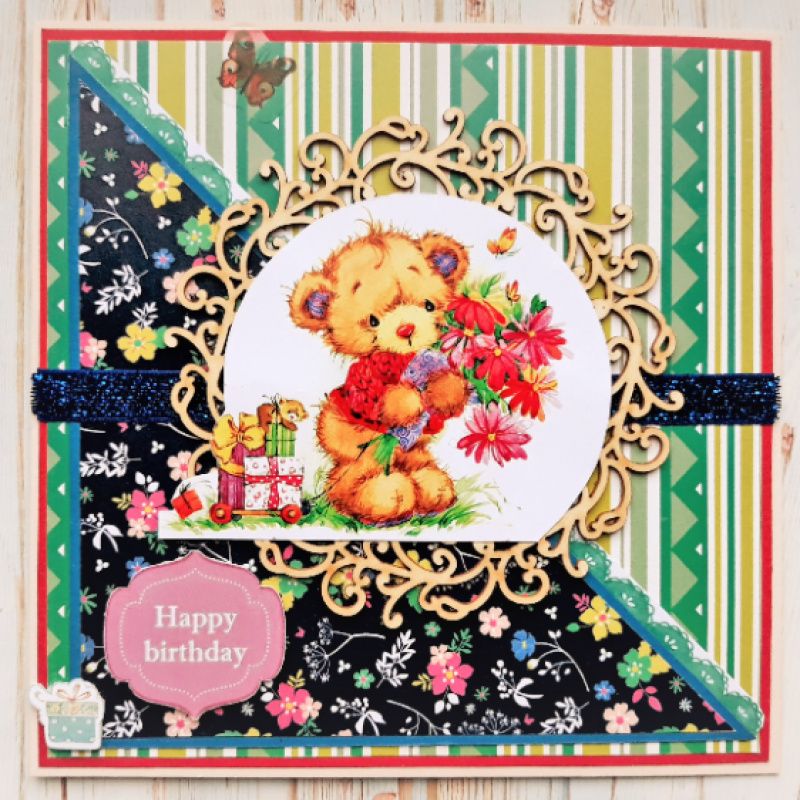 Листівка ручної роботи, прикрашена стрічкою, яка переливається і об'ємної рамочкою