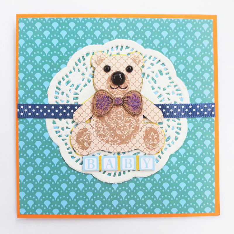 Листівка ручної роботи з ведмедиком з об'ємними очками та носом, прикрашена бантиком-чіпбордом з блискітками