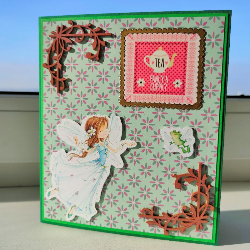 Листівка ручної роботи, прикрашена дерев'яними куточками та золотою рамочкою