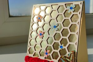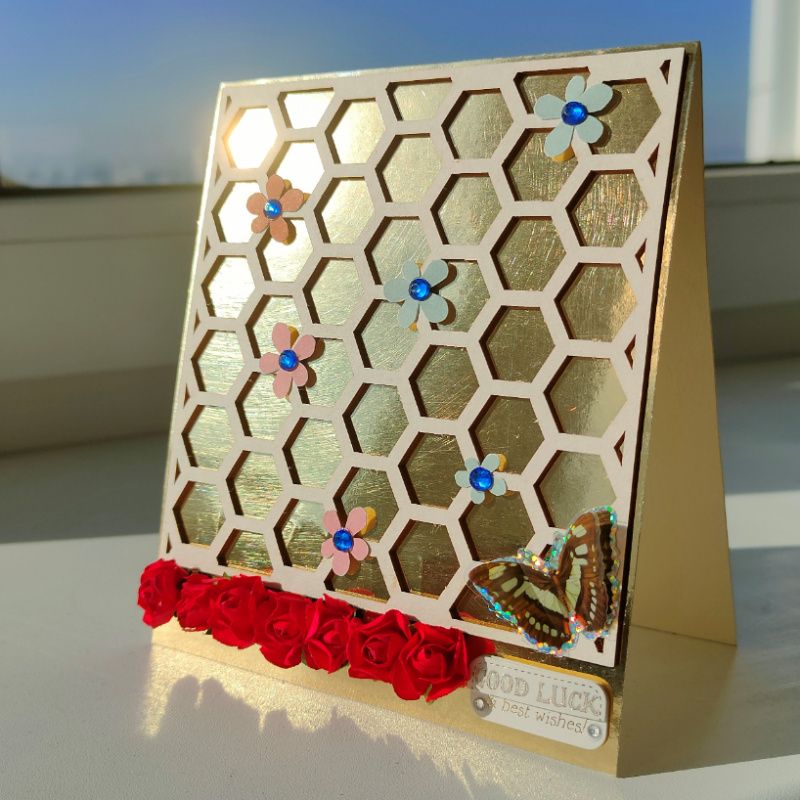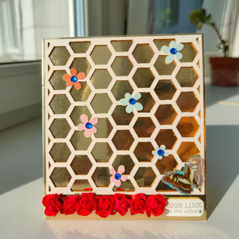 Листівка ручної роботи, прикрашена об'ємним дерев'яним чіпбордом-фоном, 3D метеликом і квітами.