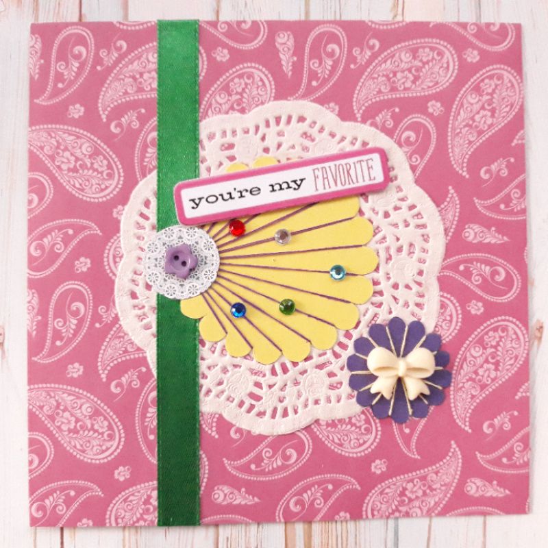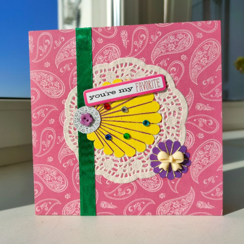 Листівка ручної роботи з використанням ниток, прикрашена стразами і декоративними елементами, відкривається як книжечка