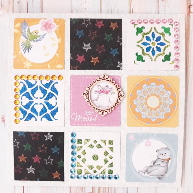 Листівка ручної роботи, прикрашена стразиками, дерев'яною рамочкою та ручним розписом.