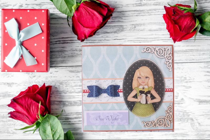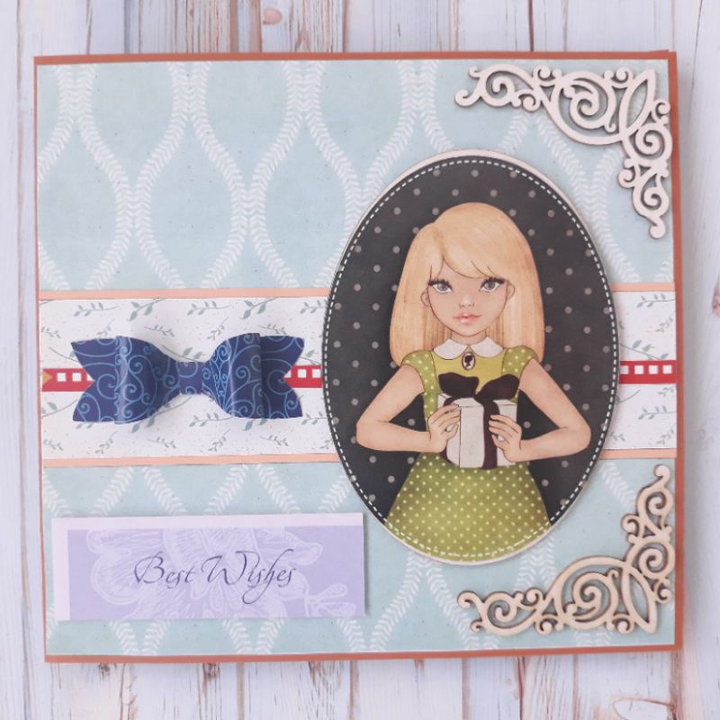 Листівка ручної роботи, прикрашена дерев'яним декором і об'ємним бантом
