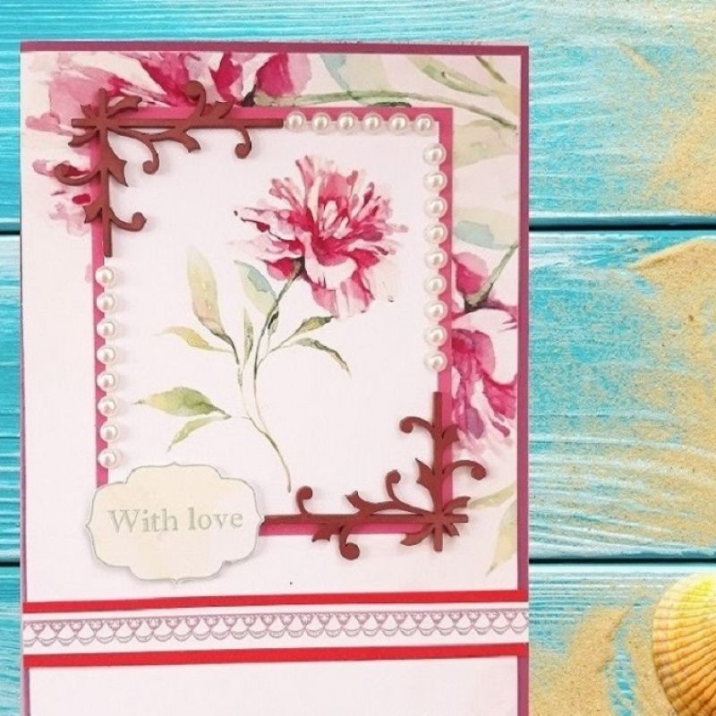 Листівка ручної роботи, прикрашена дерев'яним декором та напівнамистинками