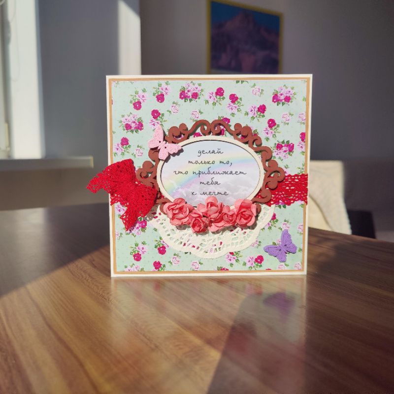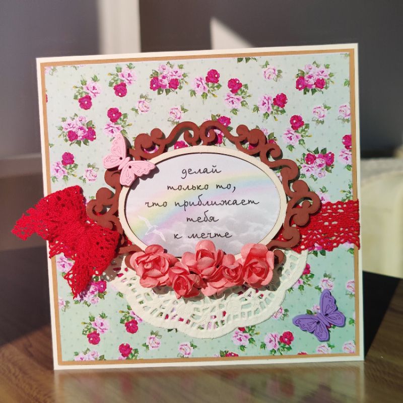 Листівка - мотивація, прикрашена квітами, мереживом та дерев'яними метеликами
