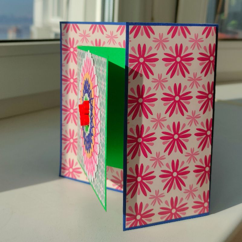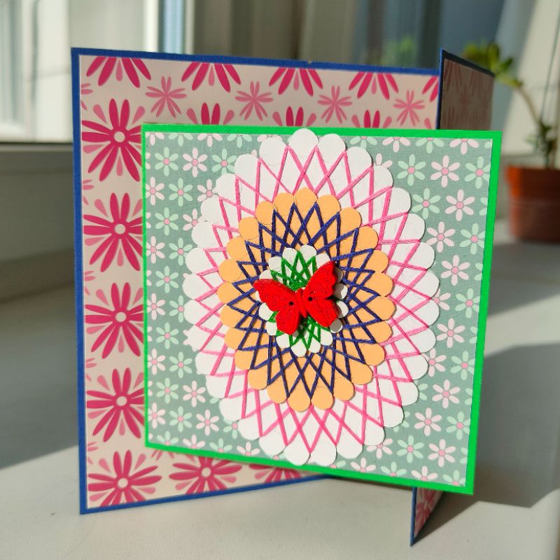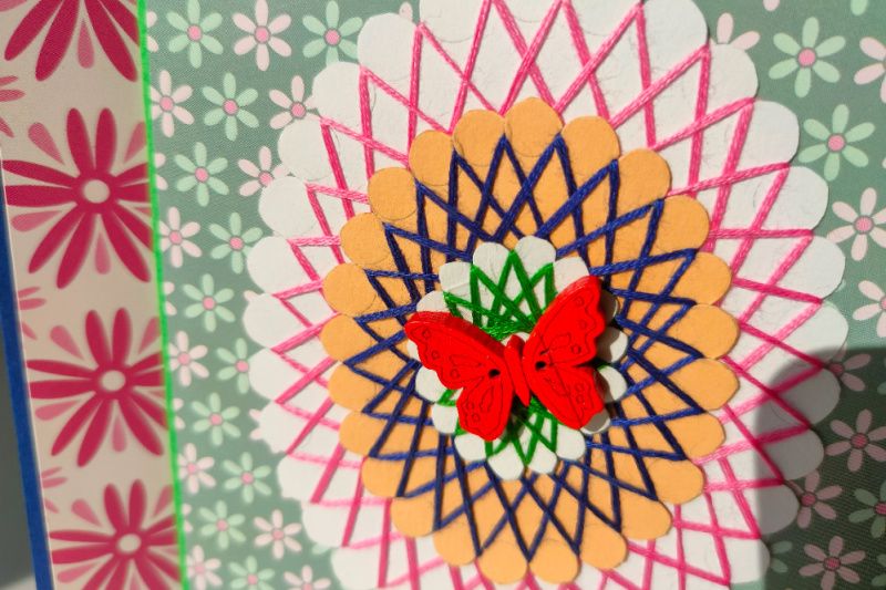 Унікальна листівка-розкладачка з використанням плетіння ниток, прикрашена дерев'яною метеликом