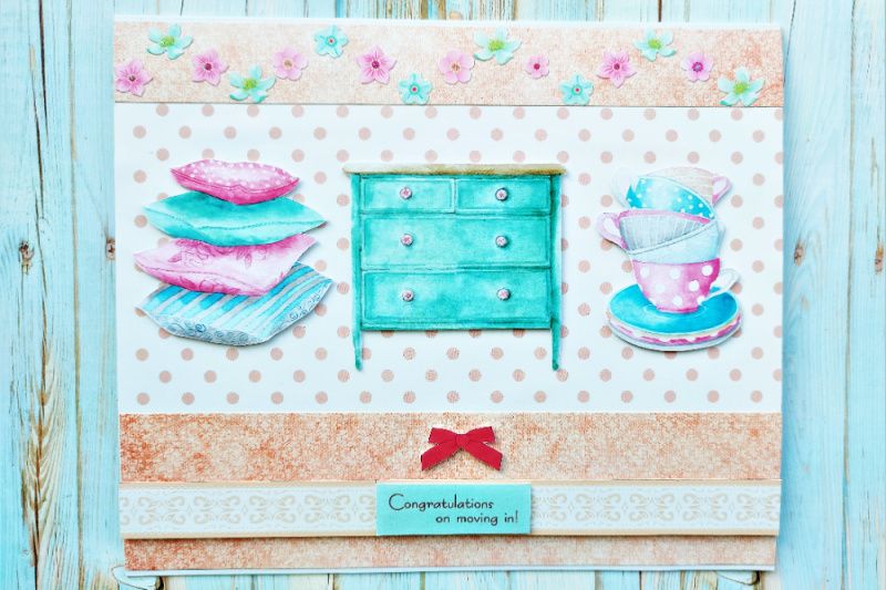 Листівка ручної роботи на новосілля, виготовлена з дизайнерського паперу та дизайнерського картону, прикрашена квітами з глітером